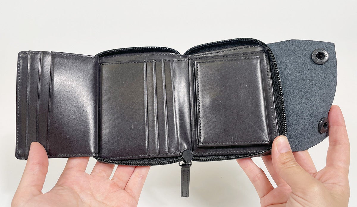 サイズを小さくしすぎず、収納力と豊富な収納スペースをキープ。広げれば内部をひと目で見渡せるので、目当ての硬貨へのアクセスしやすい構造です。