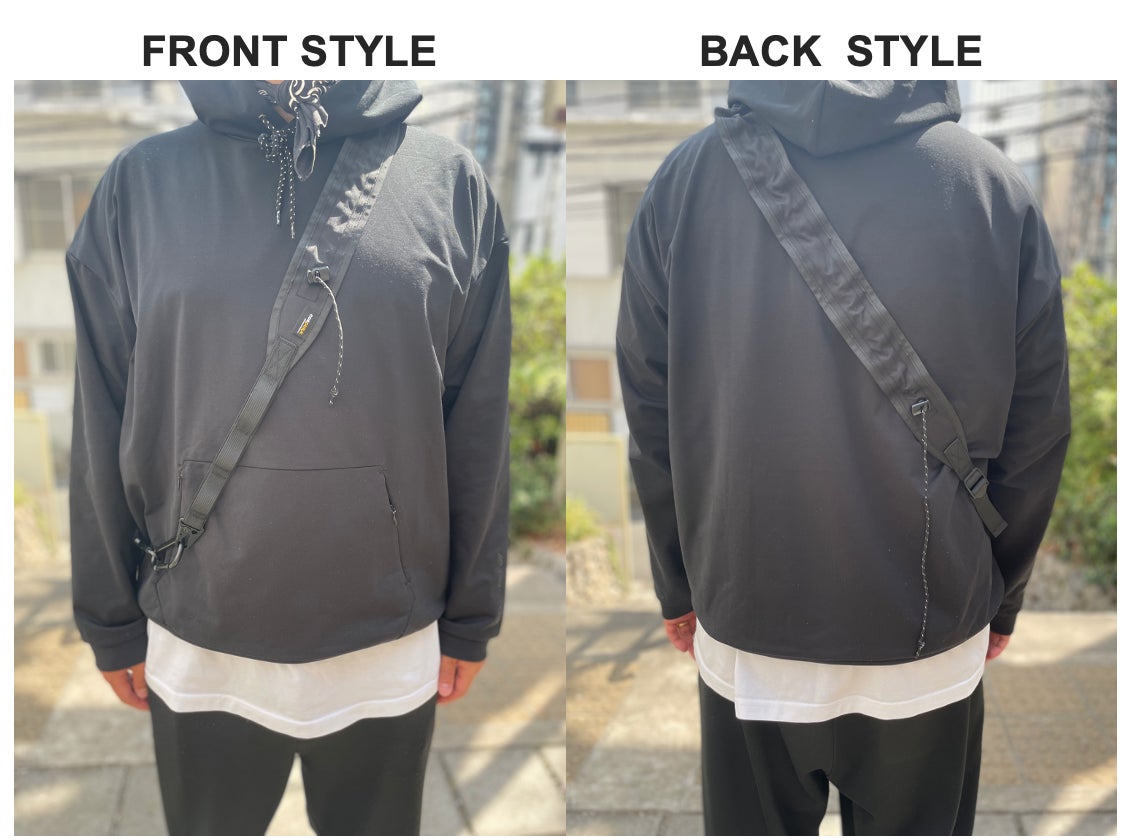背面ループに装着すれば胸や腰あたりに横向きに取り付けられるので、重みを感じにくく、より身軽に持ち運び可能です。