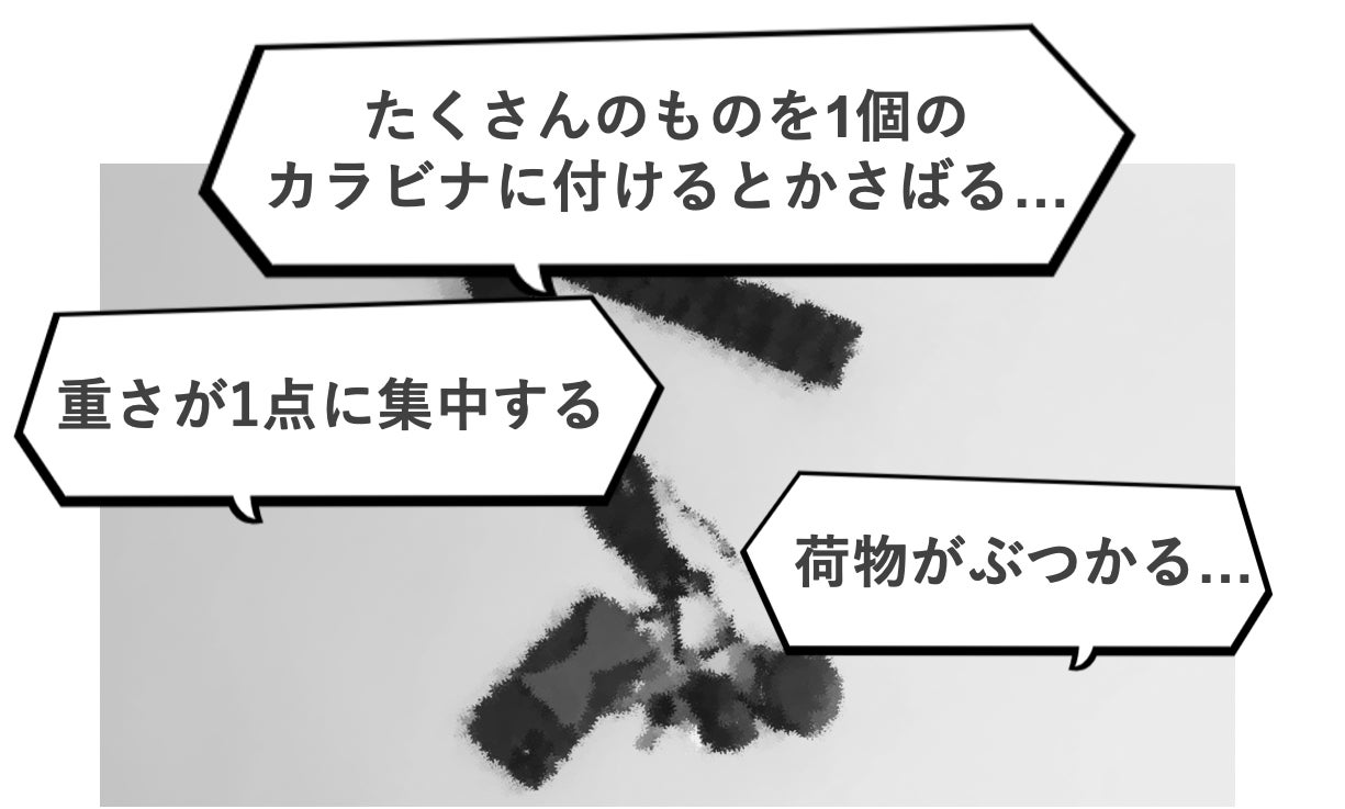 鍵やイヤホンなどをひとつのカラビナに集約する方法から、分散させられるデザインに変更しました。