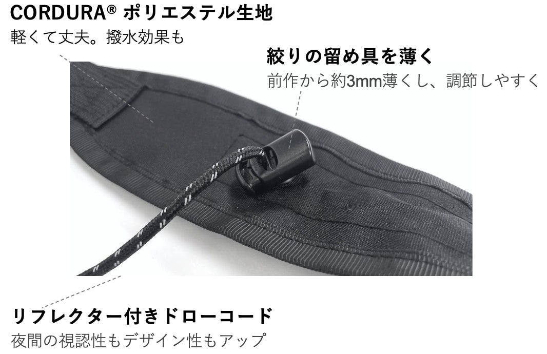 絞りの留め具を薄くし、使いやすさをとことん追求しました。さらに、ドローコードをリフレクター素材に変更。夜間の視認性はもちろん、デザイン性もアップ。