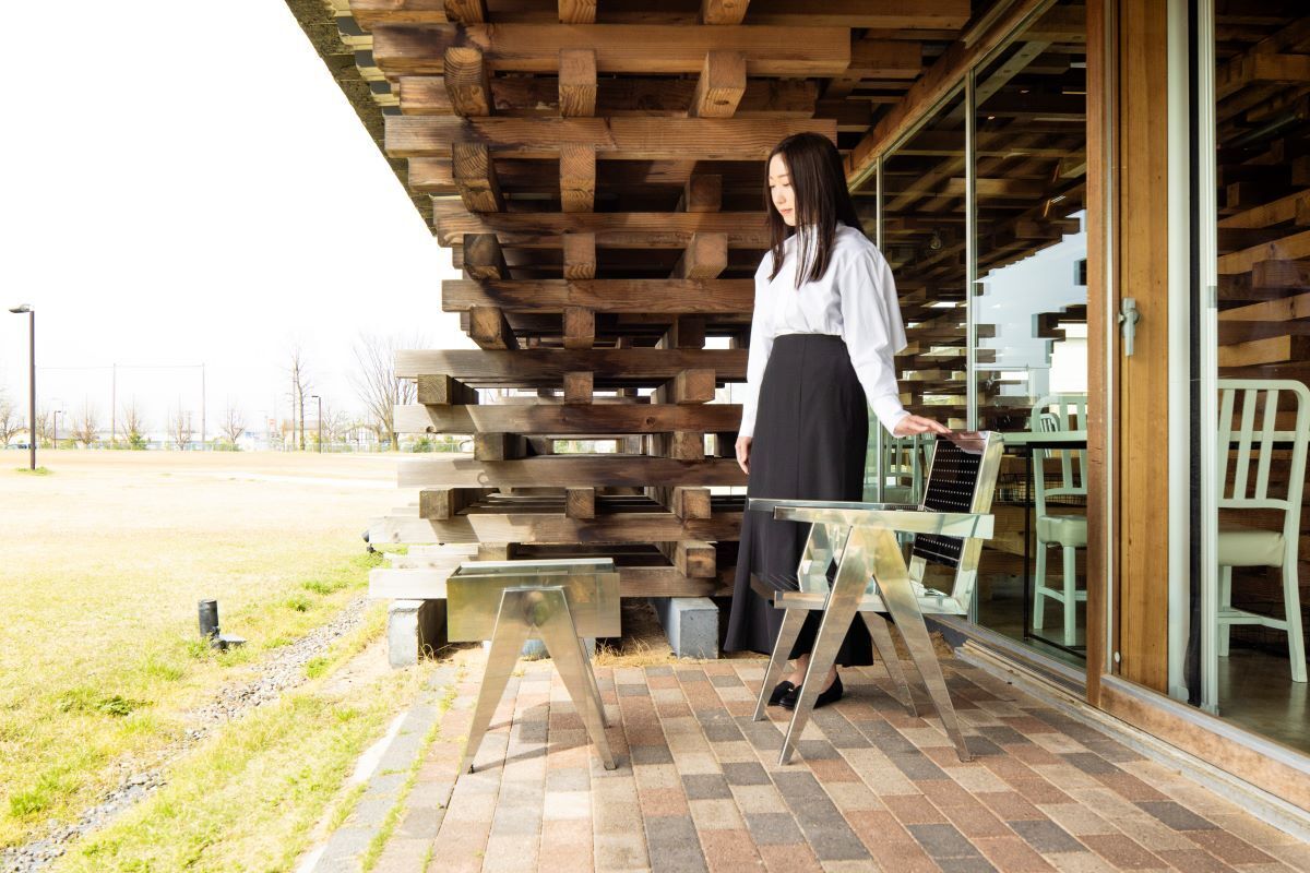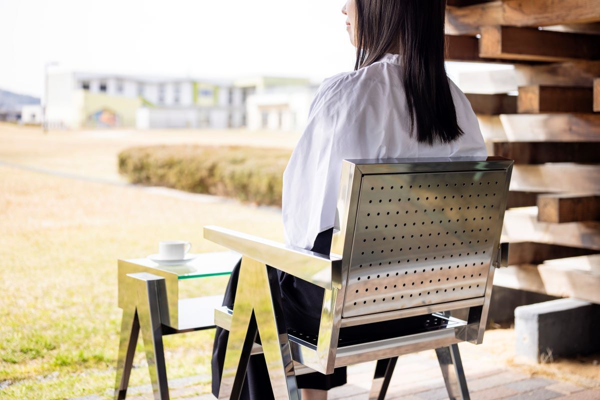 ジャンヌレのV字フレームを強調した構造はそのままに、接合部や支持部を隠さずにステンレススチールであることを強調したデザインにすることで、美しい外観を見せるようにしました。