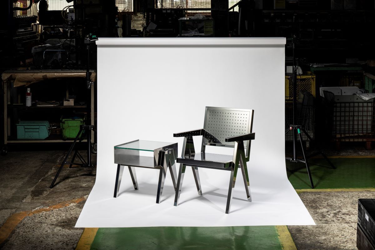 最初のシリーズでは、ピエール・ジャンヌレ(PIERRE JANNERET)の代表的な椅子とサイドテーブルを、職人の技に現代の最新技術を加えて、ステンレススチールで再現しました。どうぞ、時代を超えた合理的な美しさを堪能して下さい。