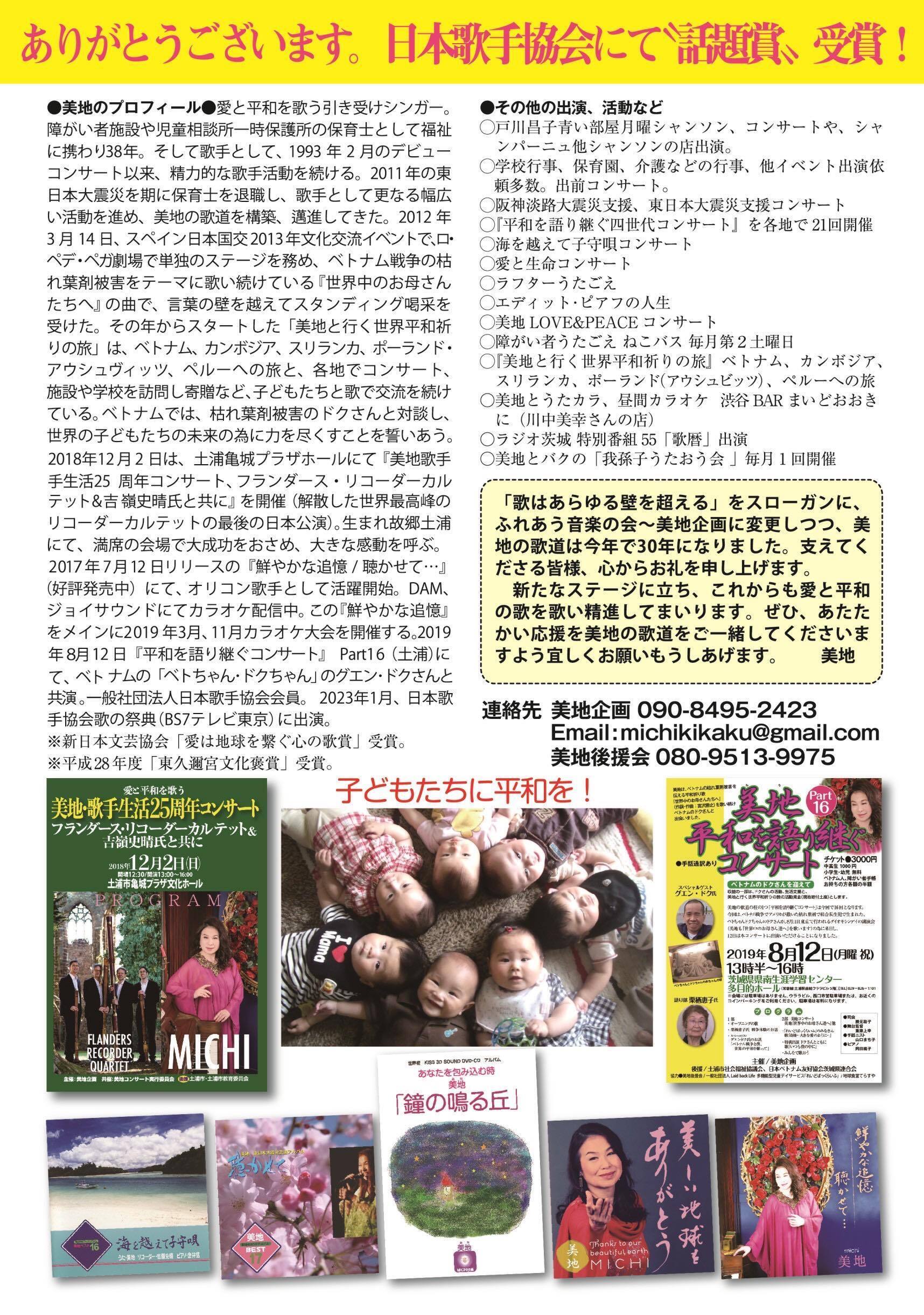 愛と平和を歌う引き受けシンガー。障害児、者施設保育士を経て、国内外で歌い交わし30年。『歌はあらゆる壁を超える』をモットーに言葉できぬ人々の思いを歌で代弁。バリアフリーコンサート企画他、戸川昌子青い部屋シャンソンコンサート多数出演。『美地と行く世界祈りの旅』はスペイン、ベトナム、カンボジア、スリランカ、ポーランドアウシュヴィッツ、ペルー、6カ国で歌い交わす。特に美地の持ち歌、ベトナム枯れ葉剤被害を伝える、平和への祈りを歌い続けている。第一回ベトナムでは、ドクさんと『子どもたちの平和に力を尽くす』と誓い合い、2019年『平和を語り継ぐコンサート16回目』はドクさんをゲストに土浦にて開催。