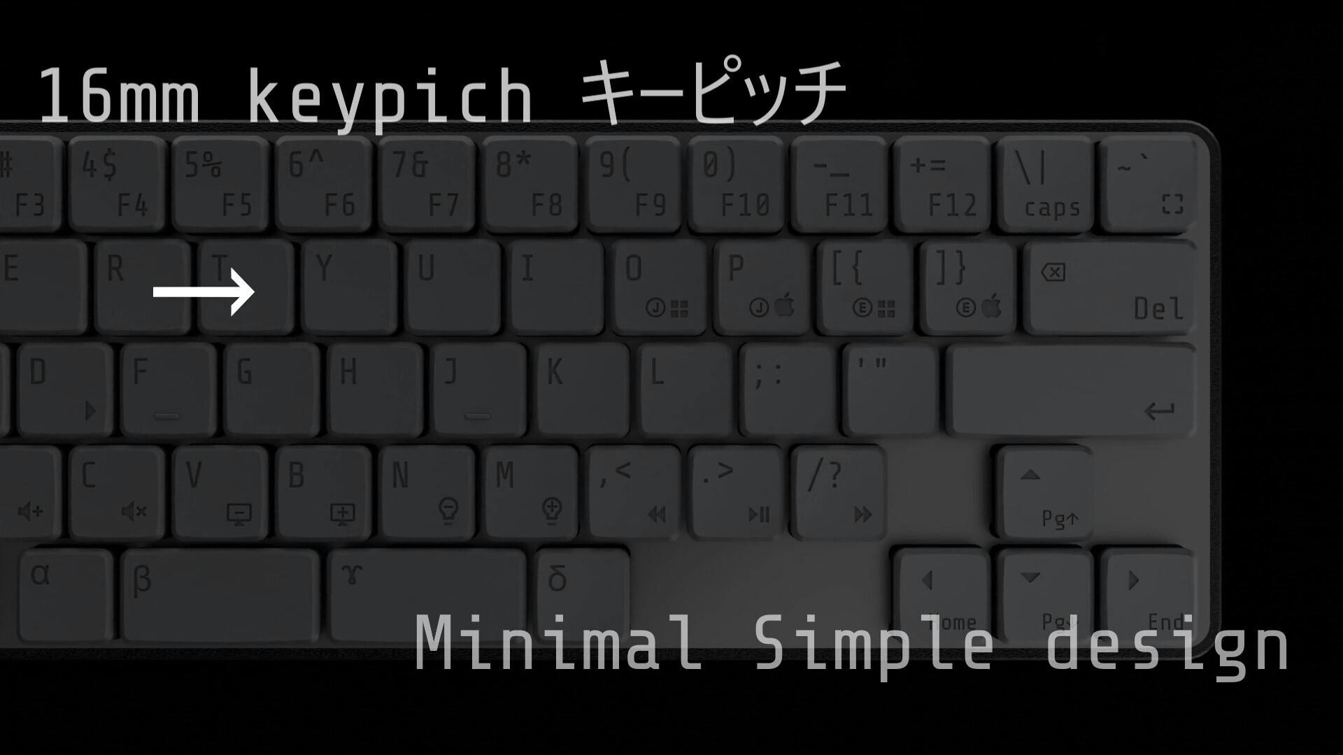 既存のメカニカルキーボードは19mmキーピッチで作られています。これはキーとキーの間隔が19mmあるということを意味します。このキーボードでは、指の移動距離を最小化させ、手首と指にかかる負担を軽減させる目的で主に、ノートパソコンと同程度の 16mmキーピッチを採用しました。物理的な移動距離を短縮されるので、これにより長時間のタイピングによる指の負荷を最小化することが可能となります。また、コンパクトなので持ち運びにも便利です。