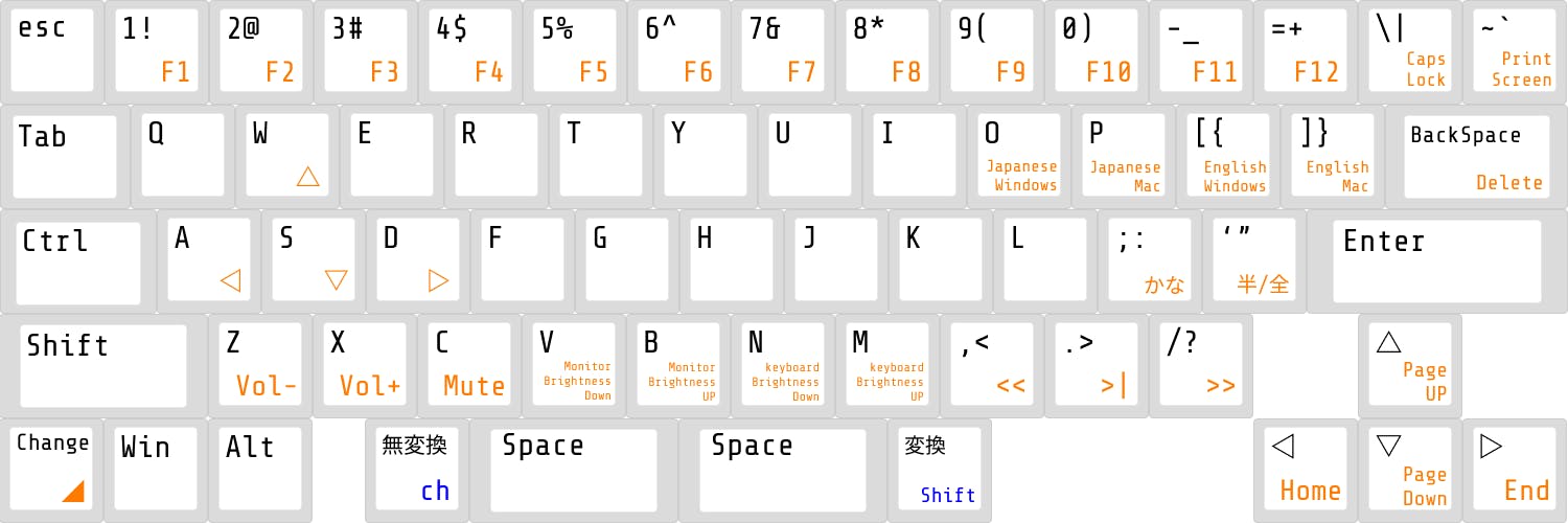 Fキーは左下にあるチェンジキーを長押しすることでオレンジ色の部分のキーは変化します。キー配列を変更する場合もチェンジキーから変更します。よく使うと思われるボリューム、モニター光量、キーボード光量、再生ストップ機能を最下段にキャプスロックにプリントスクリーン、Home、End、PageUP、PageDownとりわけAWSDが十字キーに変化する部分はタッチタイプの利便性を高めます。