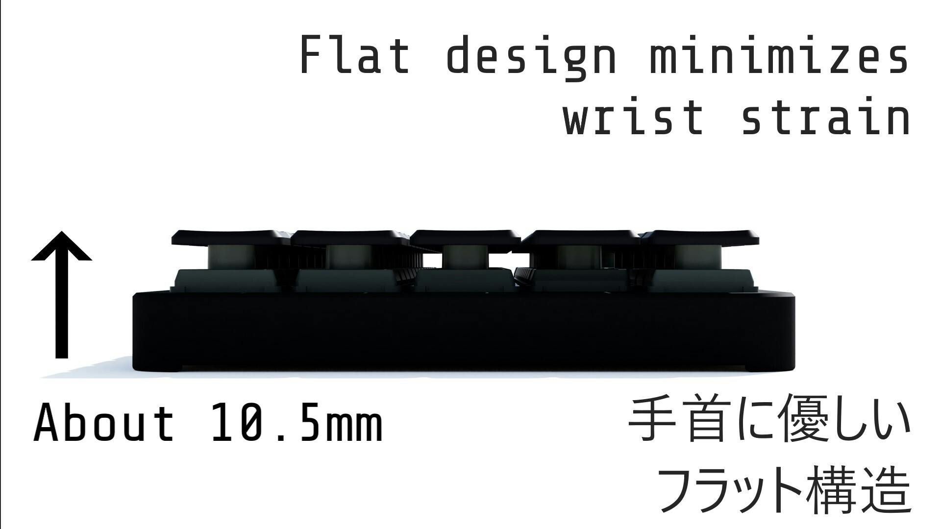 手首の負担を最も軽減するフラットデザインを採用しました。キーまでの高さ10.5mmと極めて薄く仕上げております。