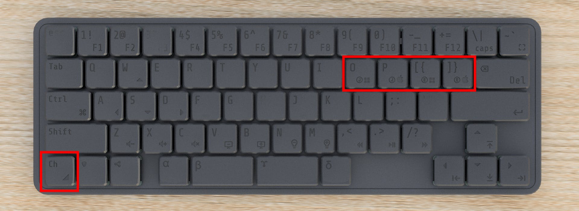 主に親指で操作する α、β、γ、δの4キーのキーキャップにはスロープをつけることで親指が引っかからないようにデザインしました。