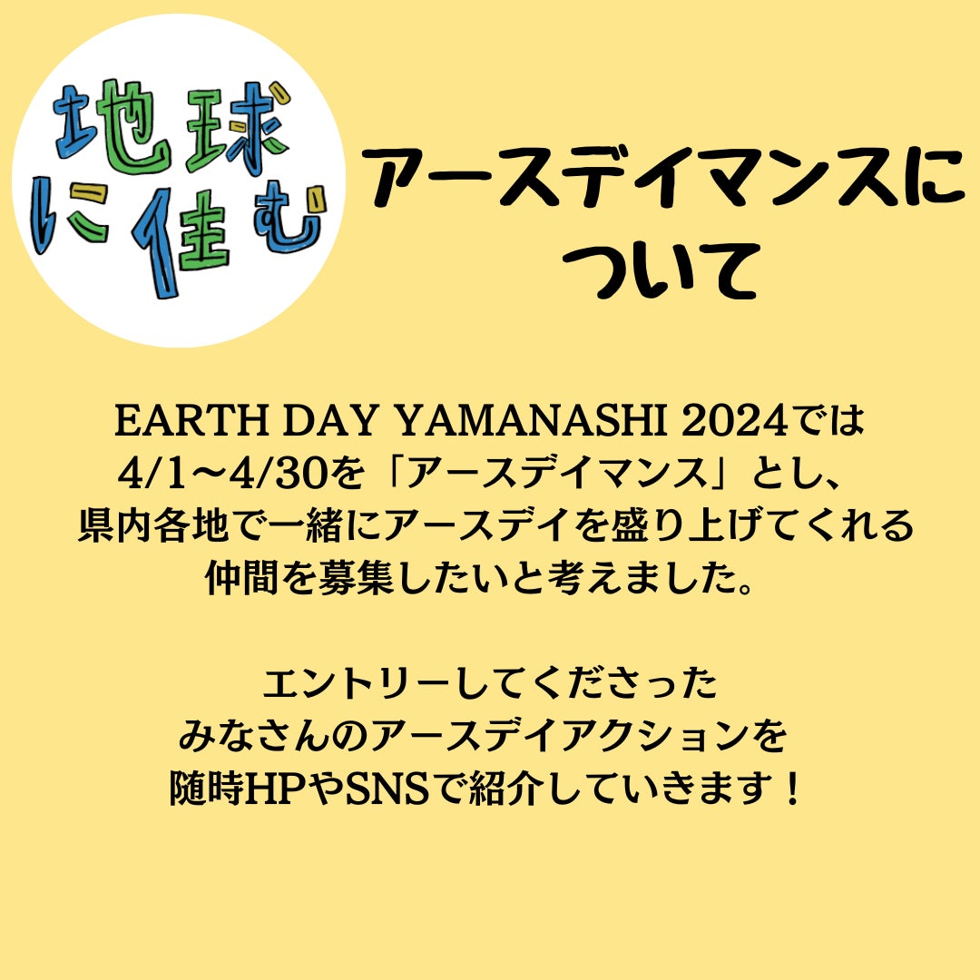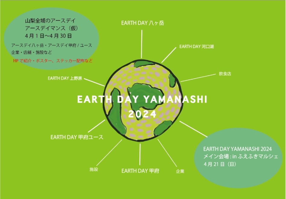 2024/4/1~2024/4/30をアースデイマンスと定め、各企業・店舗・団体・個人による様々な『アースデイ』を呼びかけます。山梨県内どこからでも、地球環境や持続可能な社会に興味がある方々がサテライト会場にて参加できる環境を実現します。