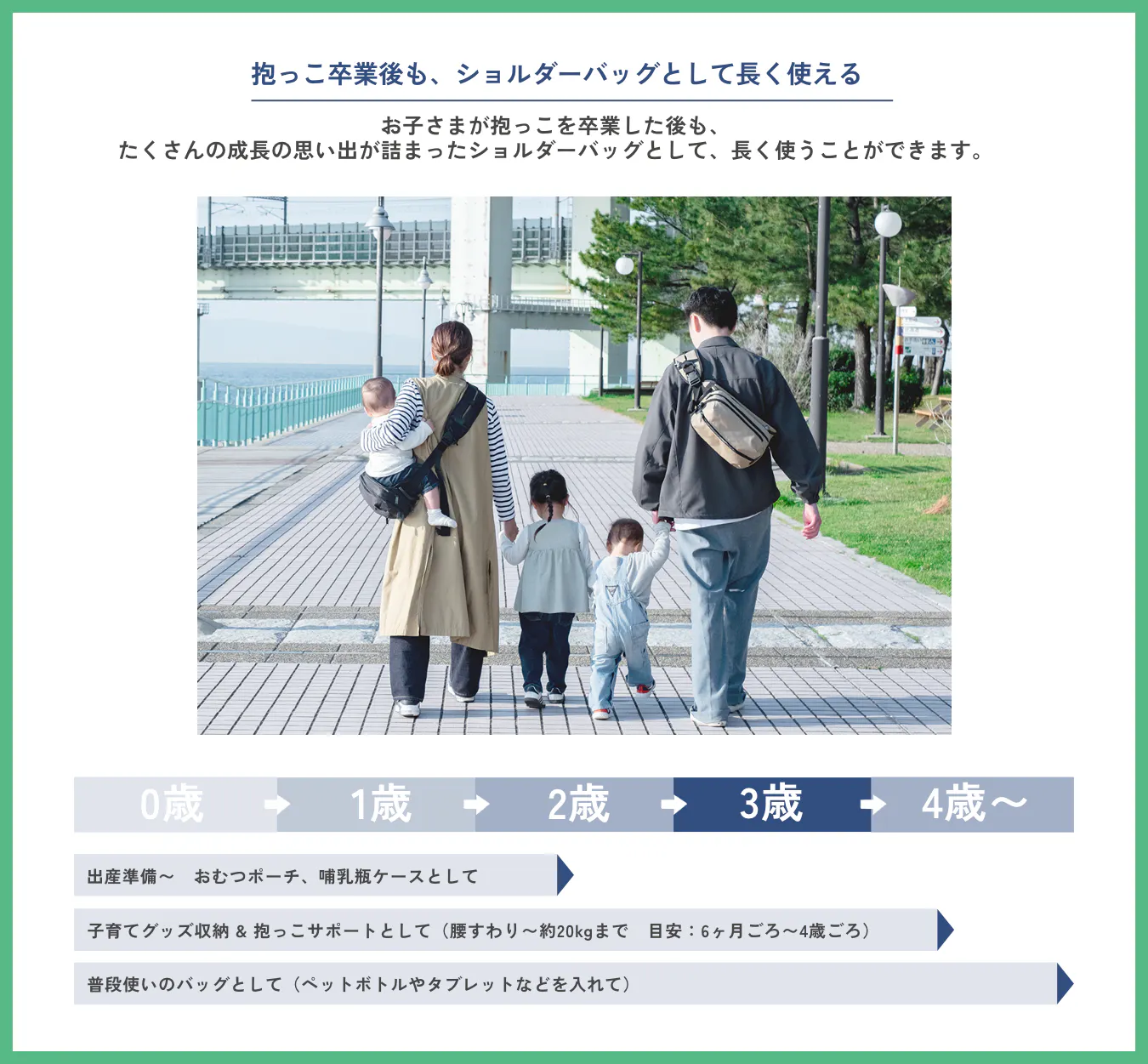 ●本製品は、腰のすわったお子さま~約20kgまで(目安: 6カ月ごろ~ 4歳ごろ)のお子さまにご使用できます。お子さまによって体型や体重が異なりますので、耐荷重および保護者の体への負担を考慮して、ご使用ください。