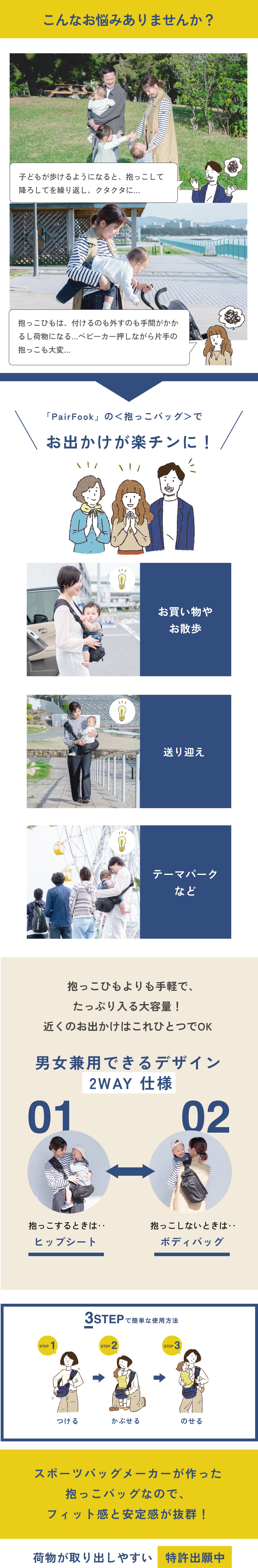 株式会社福井は長年、スポーツバッグやバイクに取り付けるバッグなどを作ってきました。だからこそ確信したのです。「もっと使いやすいベビーキャリーを作れる!」と。
