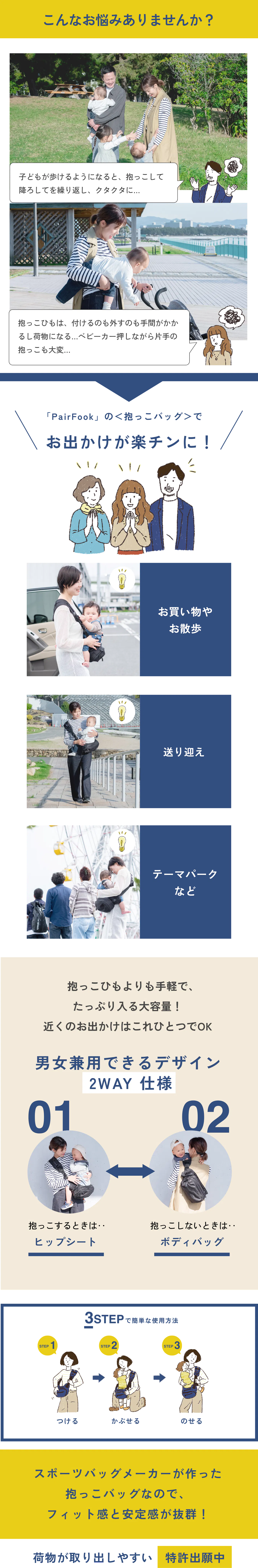 「PairFook」の抱っこバッグは、ワンタッチでバッグ本体が、クルッと使用者の方に向いてくれるので、お子さまが乗ってっても中身が溢れる事なく、荷物が取り出せます!