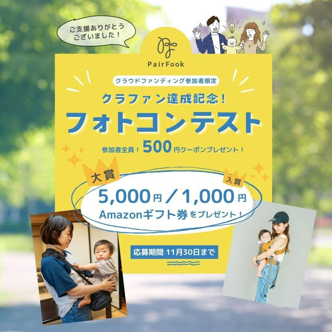 2024/11/17 15:42ご支援者各位日頃より、PairFookの抱っこ紐・抱っこバッグをご愛用いただき、誠にありがとうございます。再度のご案内になりますがクラウドファンディングにてPairFook製品をご支援いただいた皆様へ向けて特別なご案内がございます。PairFookでは、クラウドファンディング達成&抱っこ紐・抱っこバッグ販売が無事にスタートしたことへの感謝の気持ちを込めて、「クラファン達成記念・フォトコンテスト」を実施することになりました!つきましては、本キャンペーン応募フォームに必要事項をご入力のうえ、PairFookの【抱っこ紐(コンパクトタイプ)】または【抱っこバッグ】を着用した親子もしくはご家族の写真を添えて、ご応募ください。PairFookの抱っこ紐・抱っこバッグを使って、おうちでの親子のふれあいの様子、お散歩中・お買い物先で過ごしている様子などをご投稿ください。応募いただいた方には、全員もれなく「PairFook公式WEBショップで使える500円OFFクーポンチケット」をプレゼント!さらに、写真が入選した方には「Amazonギフト券(大賞5,000円/入賞1,000円)」を差し上げます!皆様からの素敵なお写真、お待ちしています!★応募フォームhttps://form.run/@pairfook-prteam-Z1X1sDX7I1aleAnQmrfK もっと見る《PairFook》抱っこ紐・抱っこバッグ着用写真大募集! 「クラファン達成記念・フォトコンテスト」開催のお知らせ