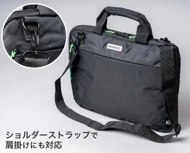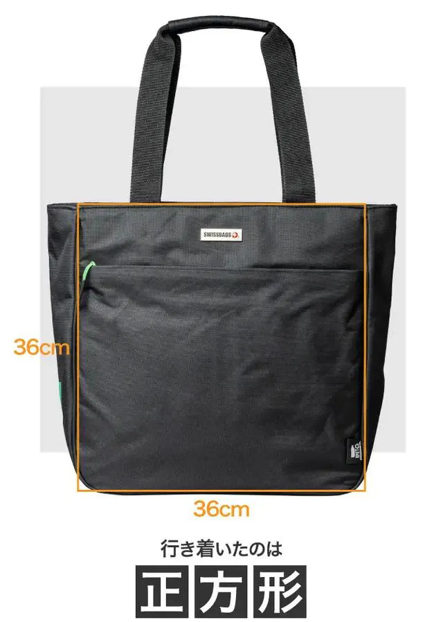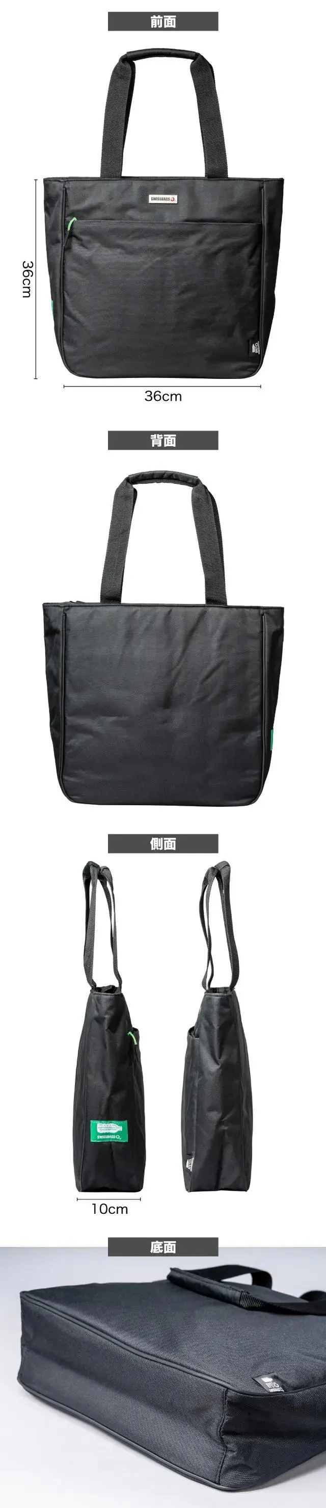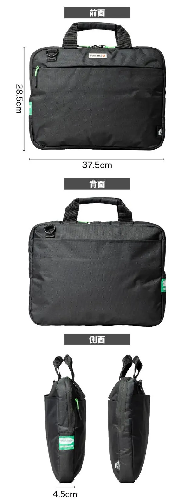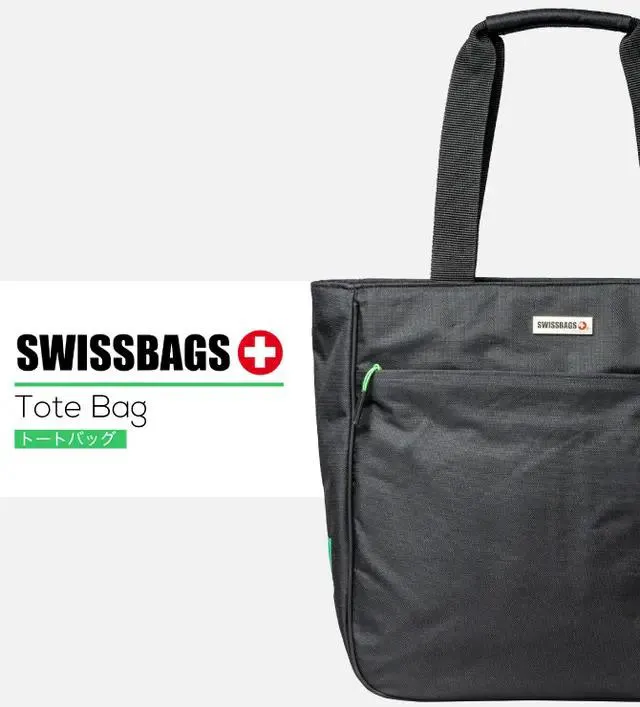 シンプルなブラックに映えるグリーンのファスナータグを使用。持ち手にはSWISSBAGSのロゴを入れ正面ファスナーを露出させない、さりげなくおしゃれ心をくすぐるデザイン。