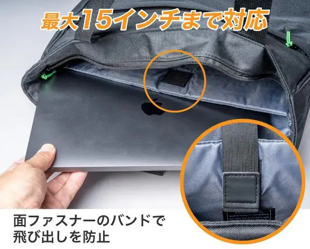 ノートパソコンを入れるスペースもあります。面ファスナーのバンドで飛び出しを防ぐ仕様になったこのスペースは最大15インチのノートパソコンまで収納することが可能です。