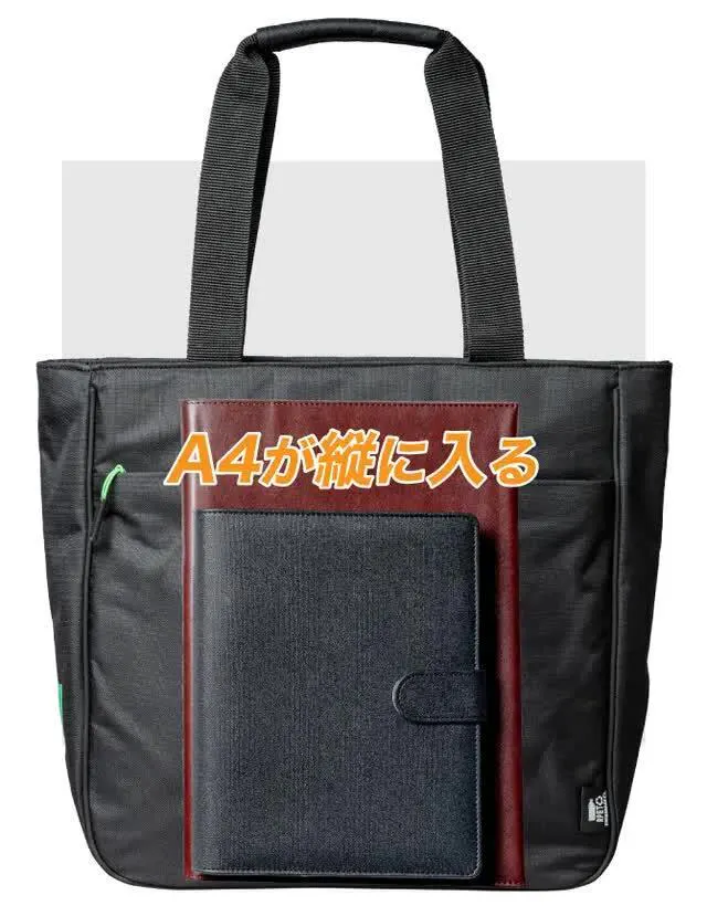 SWISSBAGSのこのトートバッグはスマートなのに、こんなにも入れることができます。ノートPC、タブレット、A4ノート、B5手帳、長財布、モバイルルーター、USBハブ、ボールペン、タブレットペン、スマートフォン、モバイルバッテリー、PC用電源アダプター、ケーブル、500mlペットボトル、折りたたみ傘を一気に収納可能です。