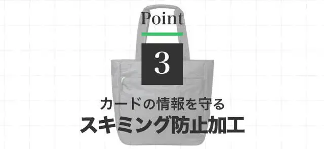 ファスナー付きのインナーポケットはスキミング防止加工が施されており、大切なカード情報などをしっかりと守ります。