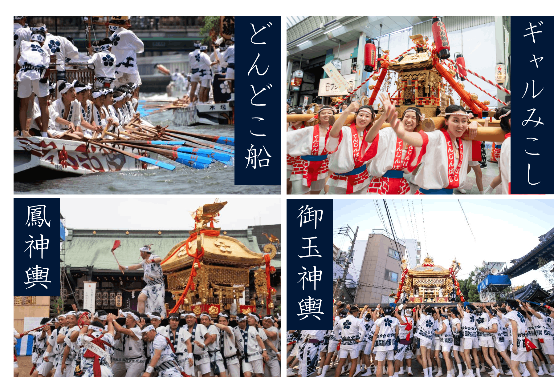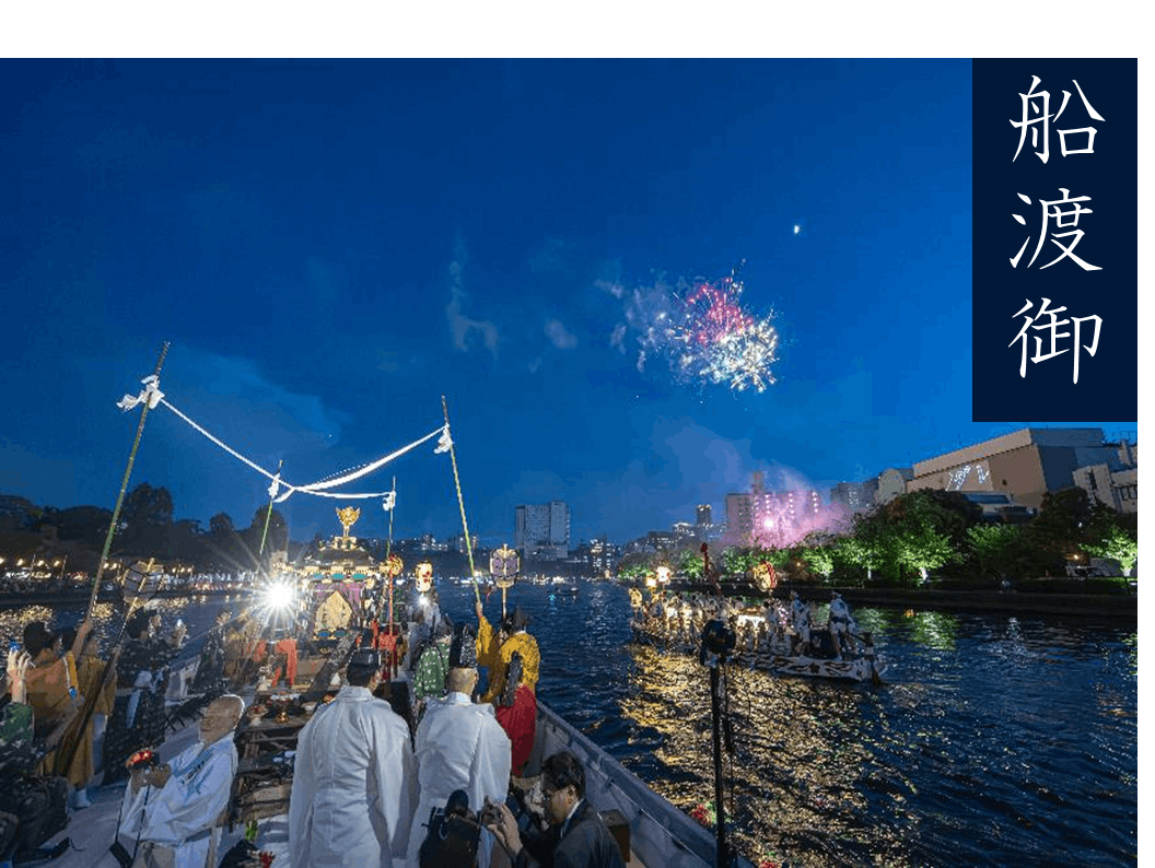 大阪市内・天満に鎮座する当宮の氏地を中心に、宵宮祭は7月24日、本宮祭は翌25日と定められ、賑やかに斎行しております。祭の中心は、当宮でお祀りしている菅原道真公です。大阪の繁栄ぶりを道真公の御神霊にご覧頂き、さらなる発展を祈願するために、氏地を巡行するのです。この巡行が、25日本宮祭の陸渡御・船渡御です。船渡御がはじまり、辺りがだんだんと暗くなってきた頃、神様に奉納する約3000発の奉納花火が打ち上げられ、見守る人々を神秘的な光景へと誘います。また、この日までの間に様々な神事・行事がおこなわれます。