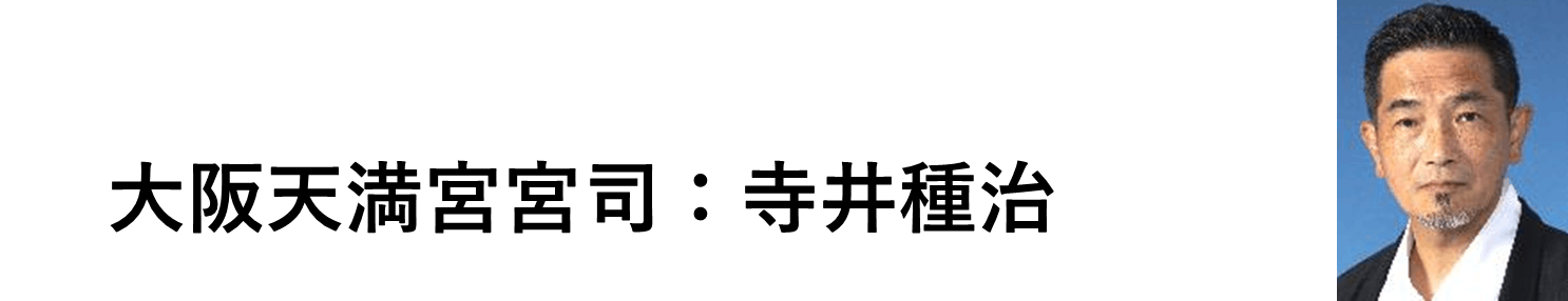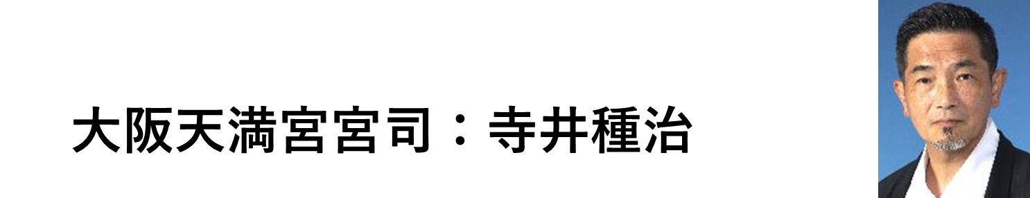 大阪天満宮宮司の寺井種治と申します。私は平成30年4月1日に第58代目の宮司を拝命しました。私ども寺井家は代々大阪天満宮の社家であり、ご先祖が代々守って来たこの大阪天満宮の歴史文化・祭を継承し後世に伝えていく使命を担っています。