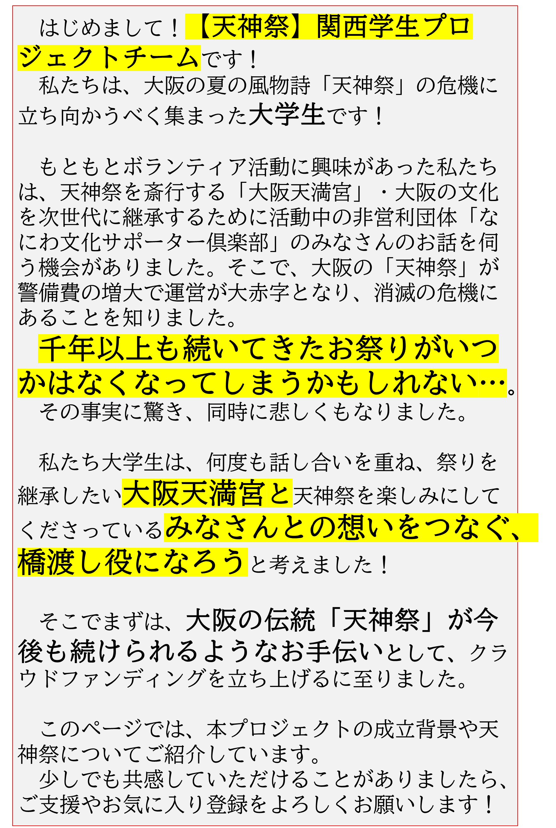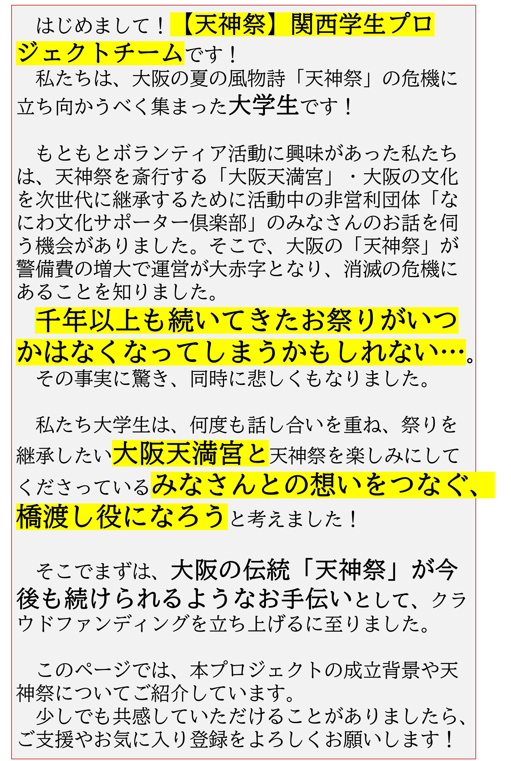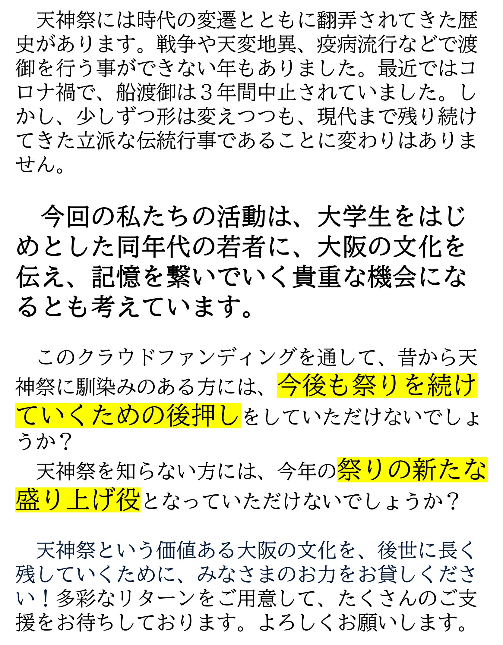 そう考えた私たちは、クラウドファンディングによる天神祭資金集めのため、動き出しました。