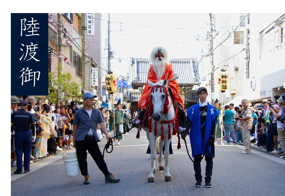 御旅所の準備ができると神様は、陸路で川岸までお出になられ、船に乗り大川を下り御旅所へ向かうルートを辿ったと言われています。この神様のお出ましを祝って、行列を組んでお供をしたり、お迎えしたりしたのが陸渡御・船渡御(りくとぎょ・ふなとぎょ)の始まりです。