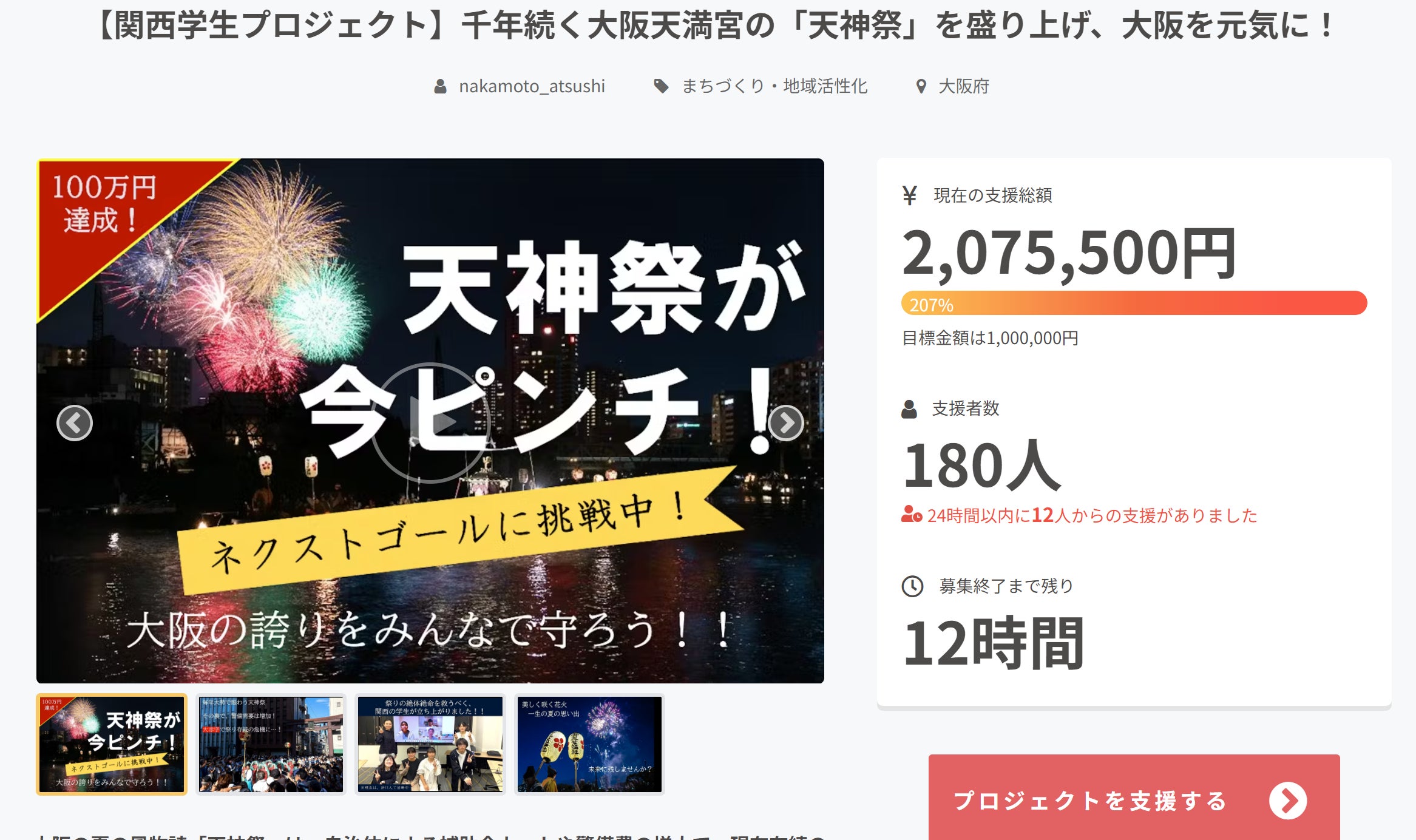 2024/08/02 11:45おかげさまで、ネクストゴール金額の200万円を達成することができました!こんな大台をまさか達成できるとは思っていませんでした…!みなさんのご支援に支えられて成り立っております。たくさんのご支援、本当にありがとうございました!!私たちは天神祭を未来に残していくために、これからも活動を続ける予定です。もしよろしければ、今後とも応援していただければ幸いです!※クラウドファンディングは本日中まで受け付けております。 ご支援がまだという方はぜひご協力のほどよろしくお願いいたします。 もっと見る