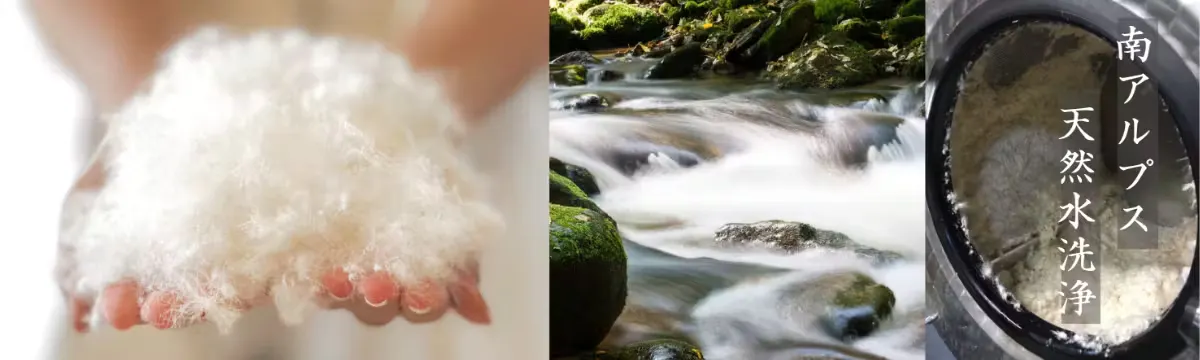 白州工場がある山梨県白州町は国内でも有数の水の郷で、多くの食品会社の拠点がございます。甲斐駒ケ岳より浸透し、数十年掛け湧き出す地下水が世界的に見ても珍しい超軟水のため洗浄に優れている水質です。 さらに約40度の温度まで温め羽毛洗浄に使用しています。たっぷりの天然温水を使用することにより、洗剤を使用しなくても【JIS】規格のさらに上の清浄度1500m以上を達成しています。
