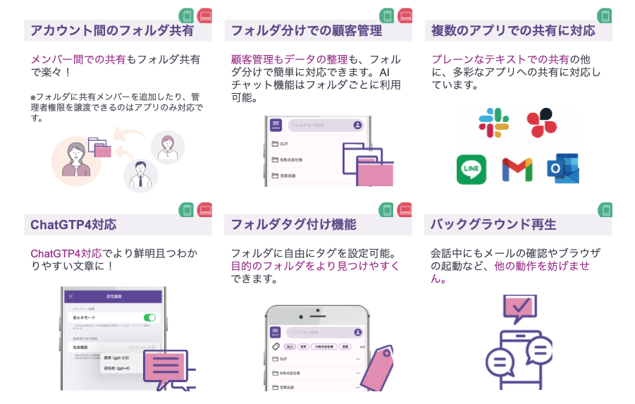 多機能な顧客管理と検索機能: 会話をフォルダ分けして顧客ごとに管理できる機能が備わっており、過去のデータの検索や整理も簡単に行えます。AIチャット機能を用いて、記録された内容に基づいて情報検索が可能です。