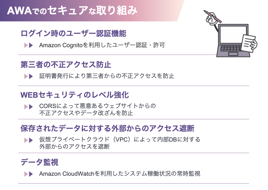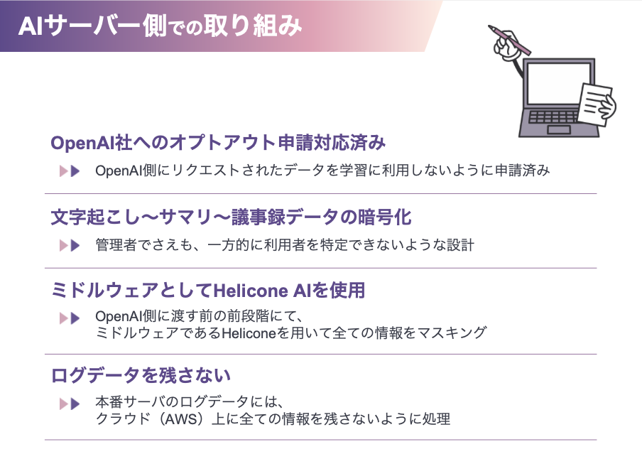 SACCAアプリのセキュリティに関しては、個人情報の正確性と安全性を確保するため、適切な情報セキュリティ対策を実施しています。具体的には、不正アクセスや個人情報の紛失、破壊、改ざん、漏洩防止に努めており、必要に応じて監査や改善を行う体制を取っています。また、AWS※のクラウドサービスを利用してデータを安全に保管しており、外部からのネットワーク障害を遮断する措置を講じています。ユーザーのプライバシー保護のために、API利用に関してもOpenAIの規約に基づいて、学習データとして利用されないことが明記されています。※AWS(Amazon Web Services)は、クラウドコンピューティングサービスを提供するAmazon.comの子会社です。AWSはセキュアなクラウドサービスプラットフォームを提供しています。DX認証マークも取得しています。