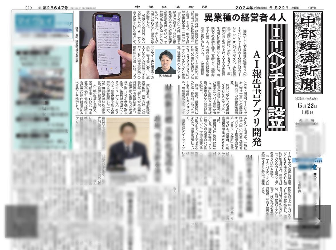 2024/06/24 13:01キャンプファイヤーにてSACCAを支援・応援いただいている皆様、この度は嬉しいお知らせをお届けです!なんと6/24(土)の中部経済新聞に私たちのサービス「SACCA」が掲載されましたー!!! それも1面にでかでかと掲載されてますからね! とっても嬉しいです!!!!紙面ではSACCAが生まれた経緯や、運営会社のUNION×DESIGNのこと、そして今後のSACCAの事業計画についての展望が掲載されております。記者さんのおかげもあり、私たちのサービスの魅力をお届けできる良い記事に仕上がってます。さっそく東海地方の企業様から引き合いやお問い合わせをいただいており、多くの企業様にSACCAを知っていただく機会が生まれ、我々一同喜んでおります。中部経済新聞は私たちが拠点を置く東海地方のブロック紙なので、東海地方以外の方は手に取る機会がなく残念です。キャンプファイヤーでのご報告となり恐縮ですが、今後ともSACCAを宜しくお願い致します。是非是非、こちらの私たちのブログ記事もご覧ください。https://sacca-app.com/chubu-economic-newspaper/ もっと見る