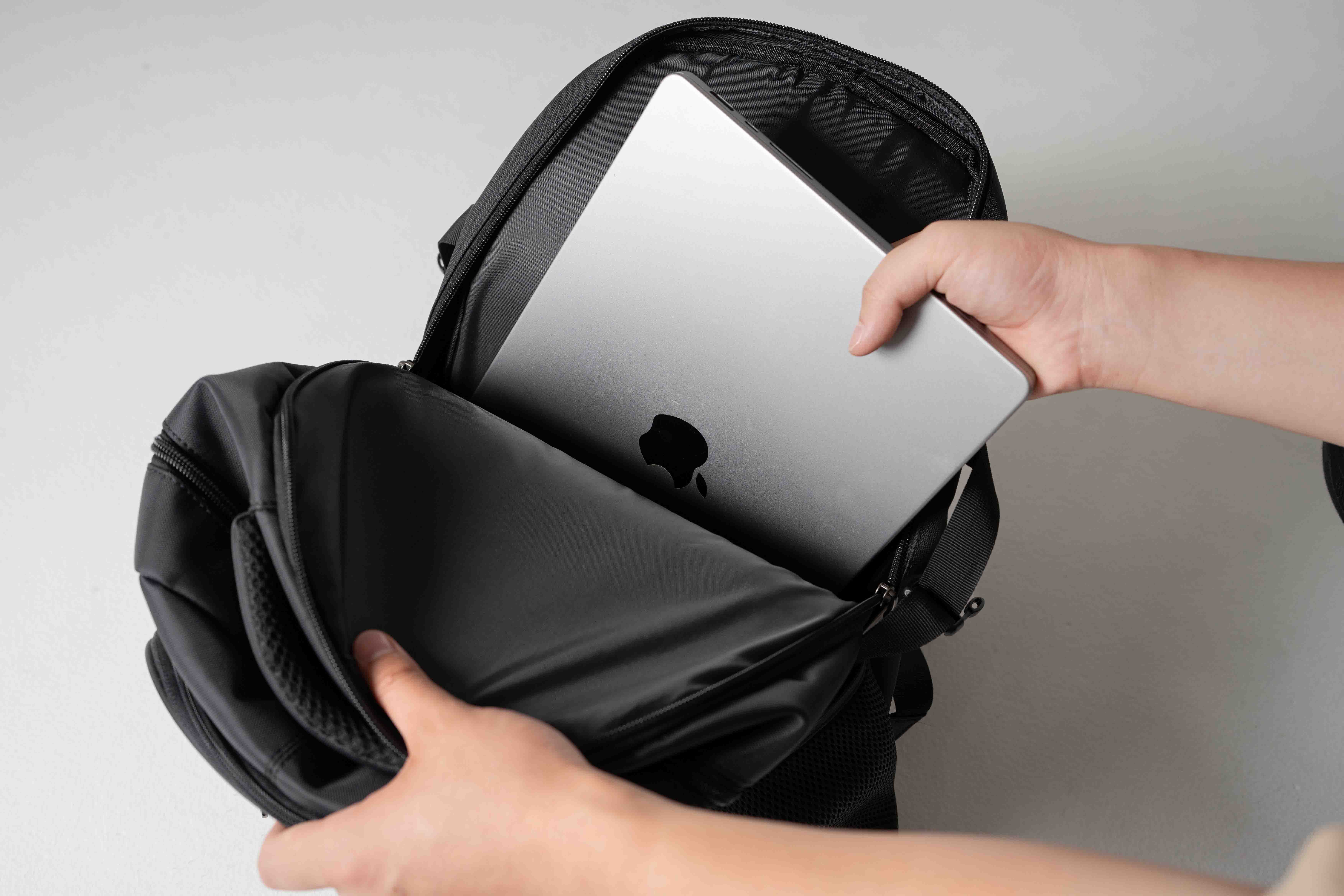 ノートパソコンやタブレット端末が収まる、PCポケットを設けました。大サイズは●17インチ、小サイズは●13インチまでのパソコンを収納可能。衝撃から守るクッション材も内蔵しており、パソコンによる背中へのあたりを和らげます。