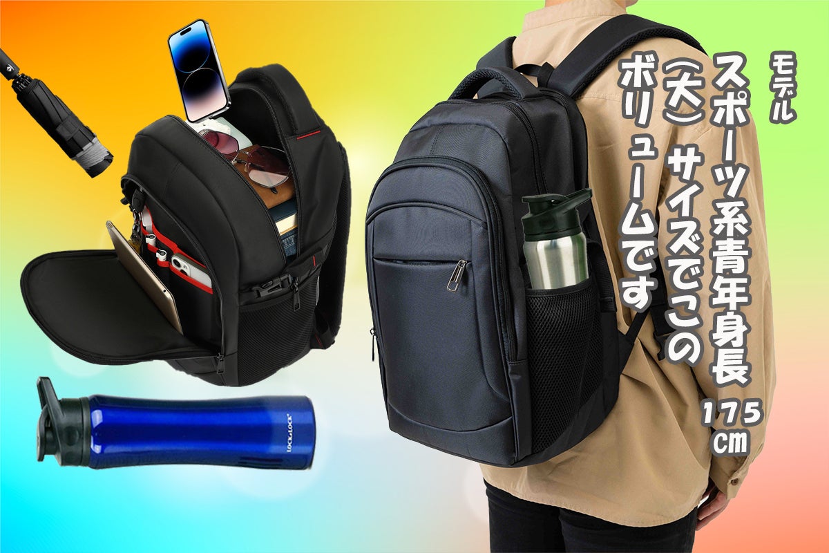 この発明品は、従来のリュックスタイルよりもっと簡単・便利・楽になります。大容量で収納ポケットも多く、小さな小物も迷子になりません。軽くて丈夫なナイロン素材で、パソコンや重い教科書を運ぶのにも最適です。