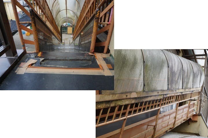 避難用すべり台の劣化が進行・・・認定品のため、補修ではなく交換が必須である