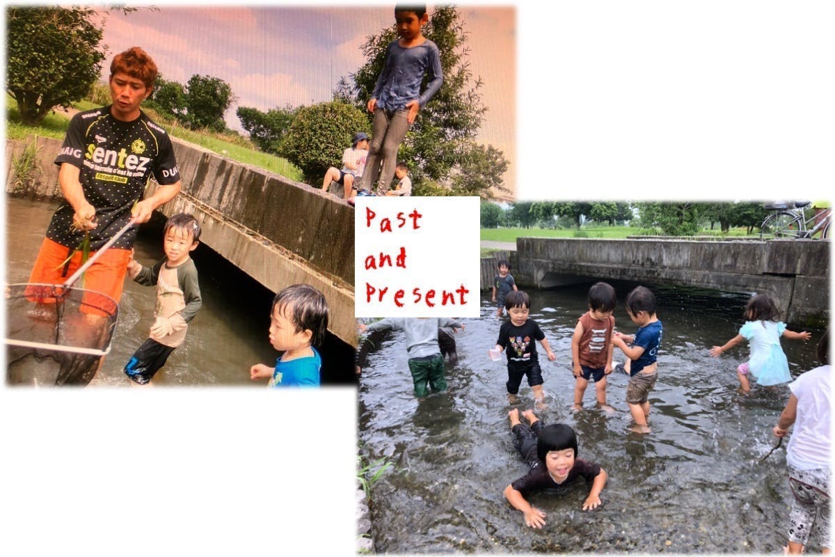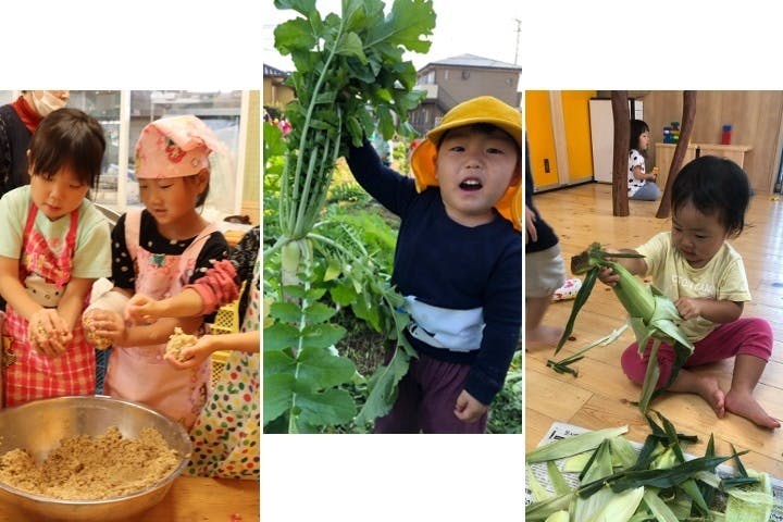 春には「じゅったんぼ」で田植え前の田んぼで存分に転がり回り、給食室特製のお弁当を持ってどどめ(桑の実)採りに行っては、口も鼻も紫の果汁だらけになって味わい、おやつのジャムも作ります。ばあば直伝の梅干し作りや味噌作り、自分の作ったお味噌をつけた採りたて野菜のおいしさにも目覚めます。野草名人のばあばに食べられる野草を教えてもらいながら探検して、帰ったらお昼ご飯の天ぷらになります。もちろん筍掘りや、時には天草や島原まで潮干狩りの遠征も、夕暮れの江津湖へホタル狩りにも行きます。