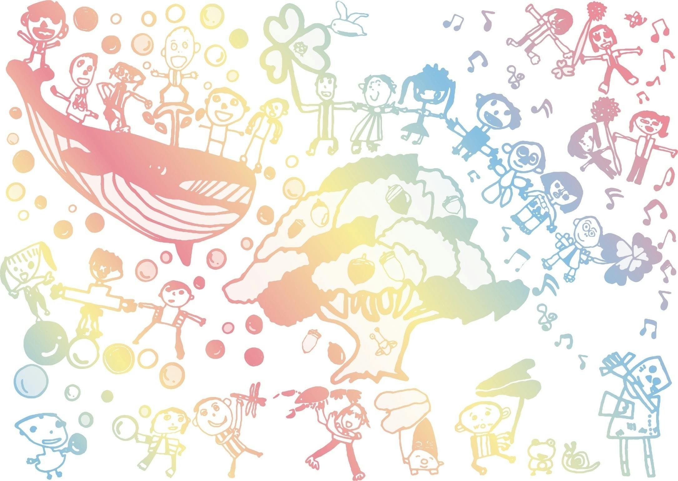 絵を描きながら、お散歩しながら、お掃除しながら、誰かが歌を口ずさみ始めると、ふわりとその輪が広がっていつの間にか大合唱。「お集まりだよー!」の呼びかけではお集まらないそれはそれは自由な人たちも、職員がピアノを弾き始めると引き寄せられるようにその周りに集まって歌い始めるのです。リズム遊びはみんなが楽しみにしている時間。自分たちの番が待ちきれずにウズウズして、出番が来ると曲に合わせて飛び出していきます。アーティスト揃いの職員が作詞・作曲したオリジナルの楽曲もたくさんあり、歌うと一瞬であの日のあの丘に、あの風の場所に立っている、そんな代々の思い出を彩っています。