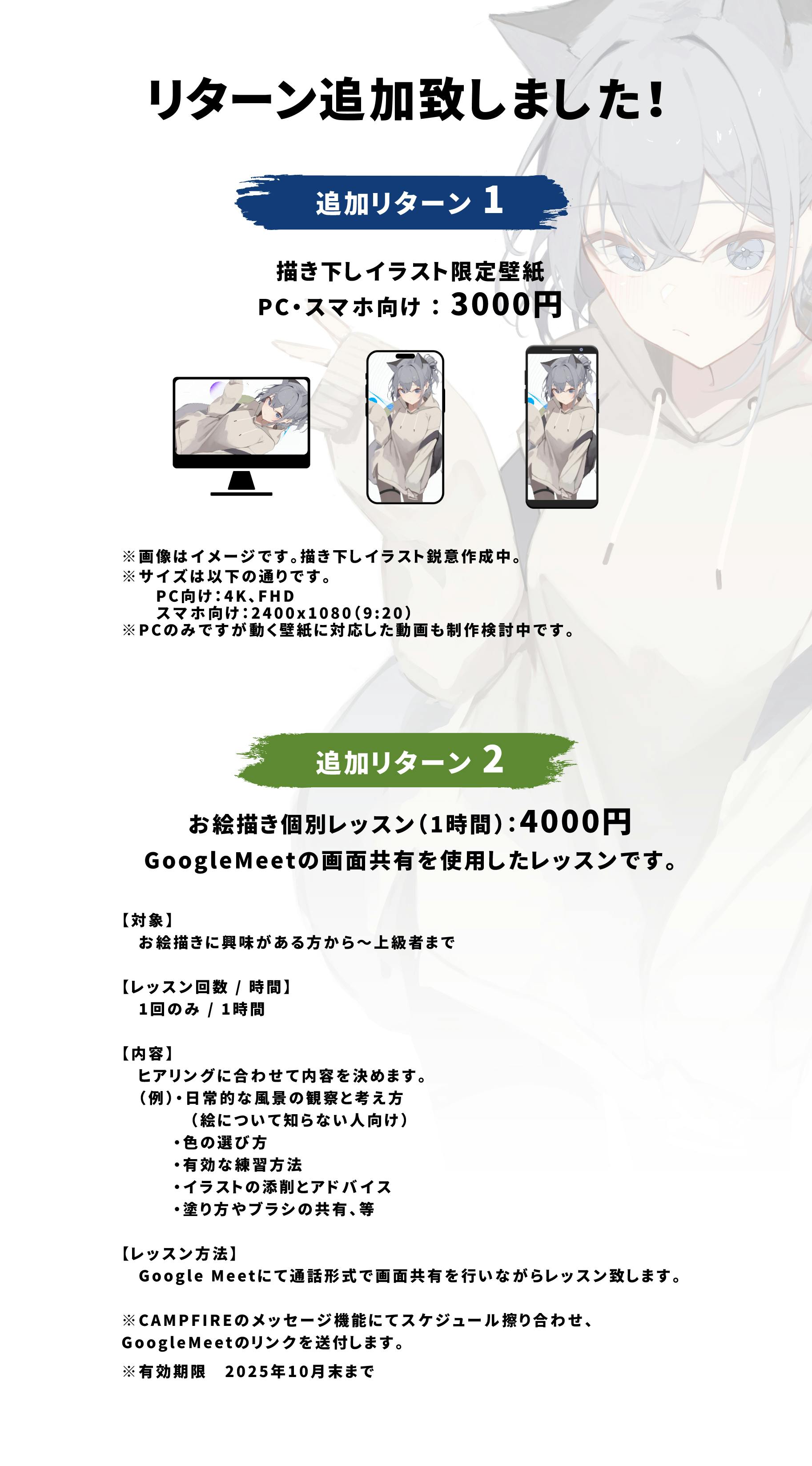 2024/06/01 06:27皆様、ご支援してくださりありがとうございました!支援総額2,676,400円(達成率76%)で目標金額350万円には届かず、プロジェクトは実行されませんが、近頃の経済的にも辛い時期にも関わらず、これだけ多くの支援が集まったことに大変感謝しております!!残念記念みたいなものですが近々グッズをpixivBOOTHにて出しますので楽しみにして頂ければと思います!また機会があれば色んなものを制作したいので、これからも応援していただけると幸いです!※コンビニ決済、銀行振込決済で支援していただいた方はこちらを参照してください(https://x.gd/2xdkp)プロジェクトの募集終了後から最大16日以内に、ご登録いただいた返金用の銀行口座に入金されるそうです! もっと見る