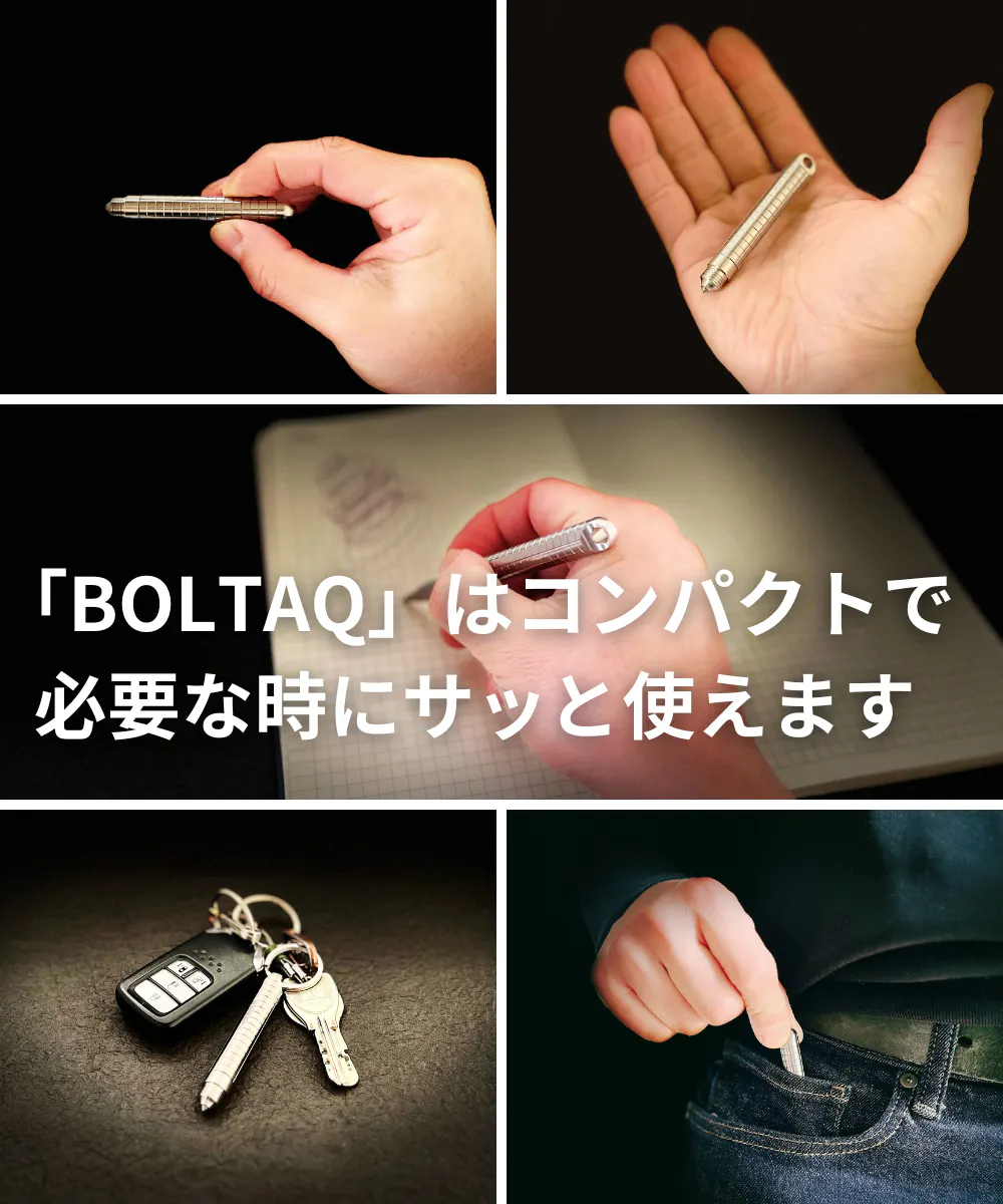 「BOLTAQ」は海外チタン加工メーカーが強さと耐久性と実用性を追求し、さらに耐腐食性にも優れたチタン素材で制作したタクティカルペンです。その軽量で斬新なデザインは、長時間の書き物でも手首の負担を軽減し、さらにガラスブレーカーで緊急時や防犯にも役に立ちます。「BOLTAQ」を常に近くに置いていただき皆様の相棒として使っていただけたら大変嬉しく思います。これから「BOLTAQ」を皆様にお届け出来るのを楽しみにしております。今回のプロジェクトに精一杯取り組んで参ります。