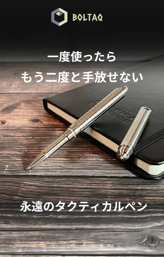 品質とデザインに優れたボルトアクション式チタンボールペン「BOLTAQ」を誇りを持ってご紹介します。「BOLTAQ」はチタン素材で軽量で強く耐腐食性があり、スムーズな書き心地と緊急時のガラスブレーカーを提供します。使いやすさとスタイリッシュなデザインが特徴で、日常生活を楽しく、特別なものにします。是非手に取って使ってください。