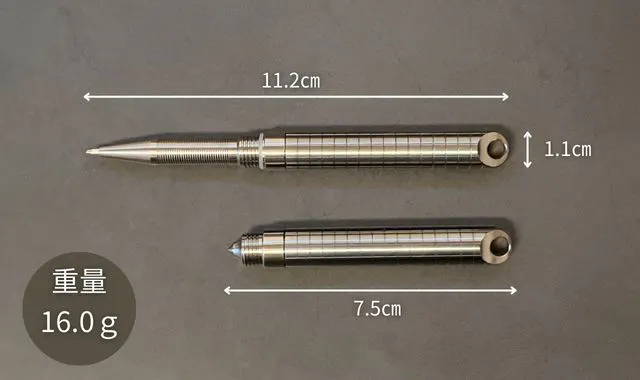 A:ボールペン時は長さ11.2 cm、直径1.1㎝です。ガラスブレーカー時は長さ7.5㎝、直径1.1㎝です。