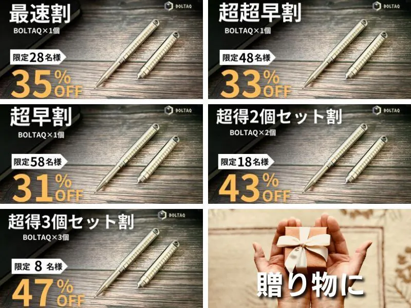 今回、ボルトアクション式チタンペン「BOLTAQ」をmachi-yaだけの特別割引でご提供させていただきます。