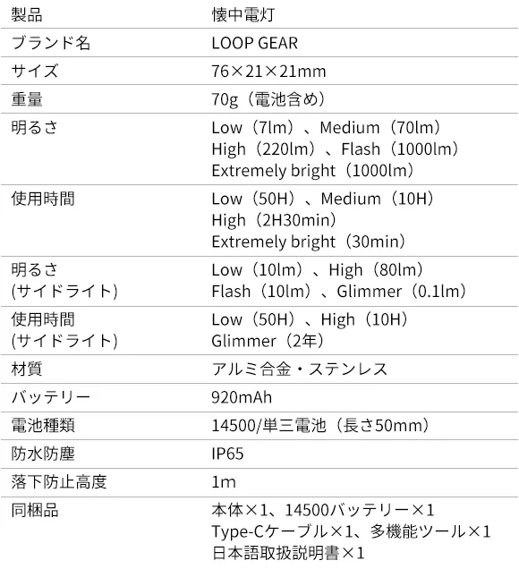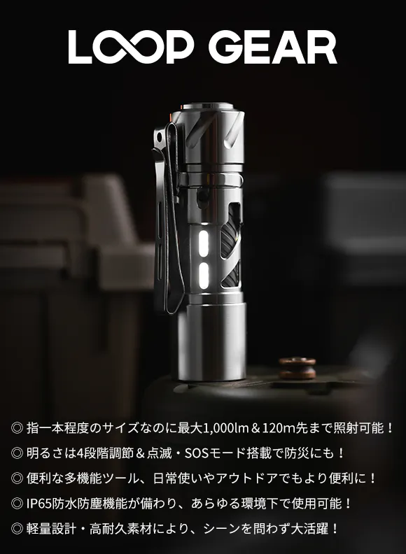 わずか70gという超軽量で手に収まるミニサイズなのに、明るさ最大1000ルーメン、照射距離最大120mを実現したパワフルな懐中電灯「LOOP GEAR」。