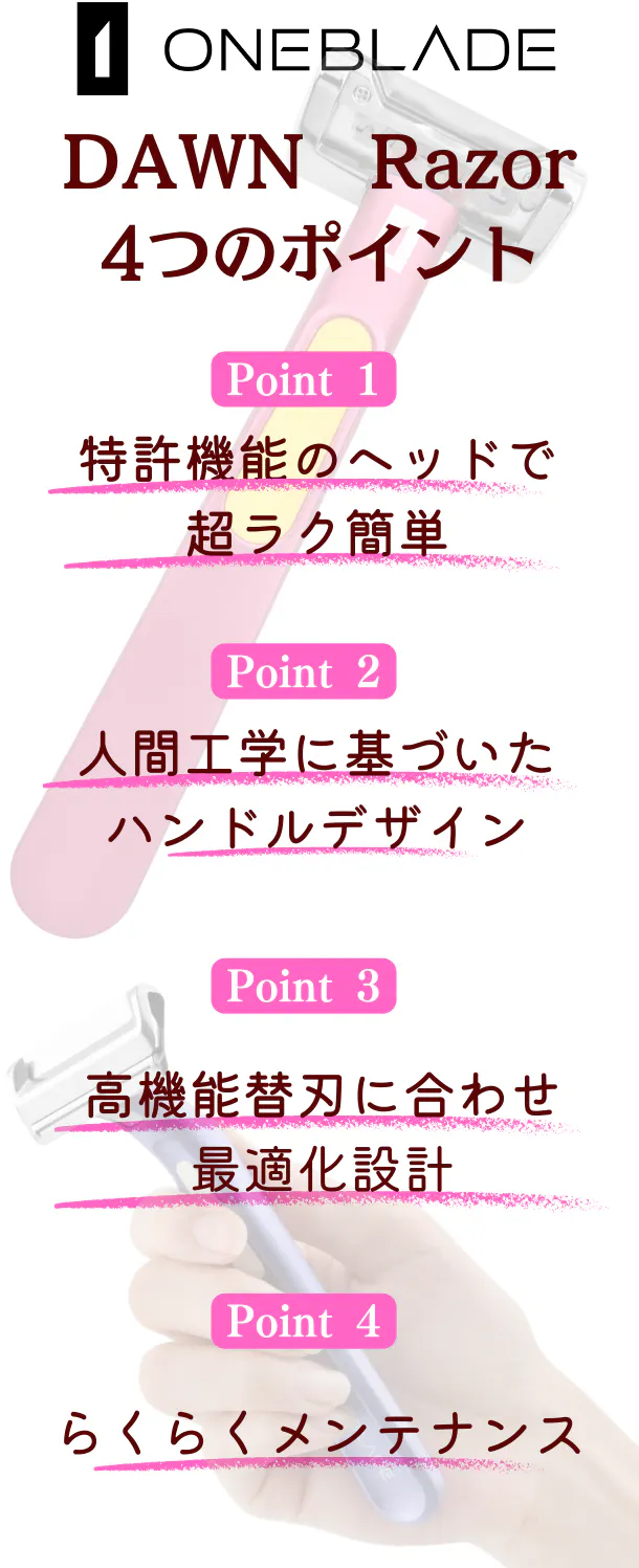 ※使用モデルはGENESIS RAZORですが、特許取得済みヘッド構造は、DAWN Razorを含むOneBlade全製品に搭載されています。