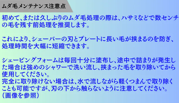 細かいストロークで剃る方法も併用して処理することをお勧めします。