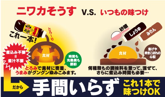 つまり・・・「ニワカそうす」は味つけしながら、同時に、素材のおいしさを引き出します。だから、料理や素材に応じて味が変わるんです。