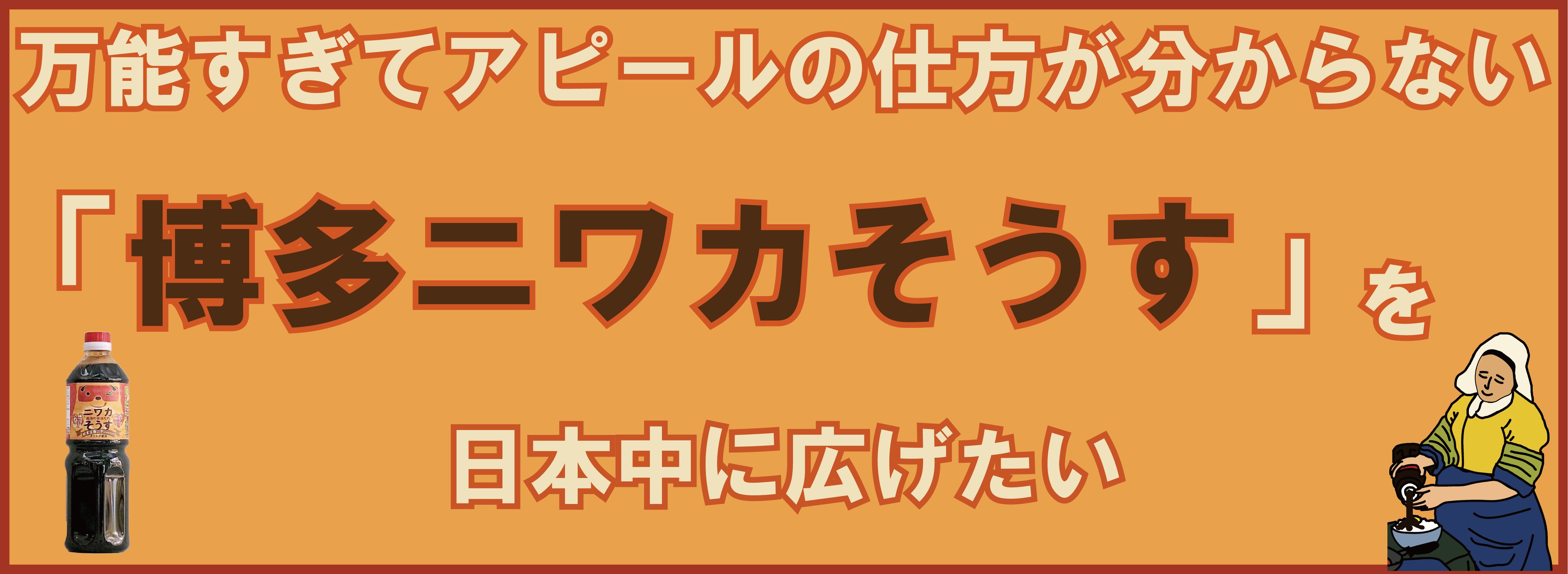 実行者:オリジナルブランド「FOG」を展開する福岡の企業1954年の創業から現在に至るまで、建設資材、テント事業、鉄鋼・ステンレス製品、建築建物、各分野で培ってきた歴史と経験を新しい発想のギアに集約。今回はタケシゲ醤油の1ファンとして、「博多ニワカそうす」の虜にされたあの時の、あの衝撃を世界に広めたく思いページ作成、デザイン、リターン品の設定や準備など、タケシゲ醬油様の力になれるようプロジェクトの実行をさせて頂いております。