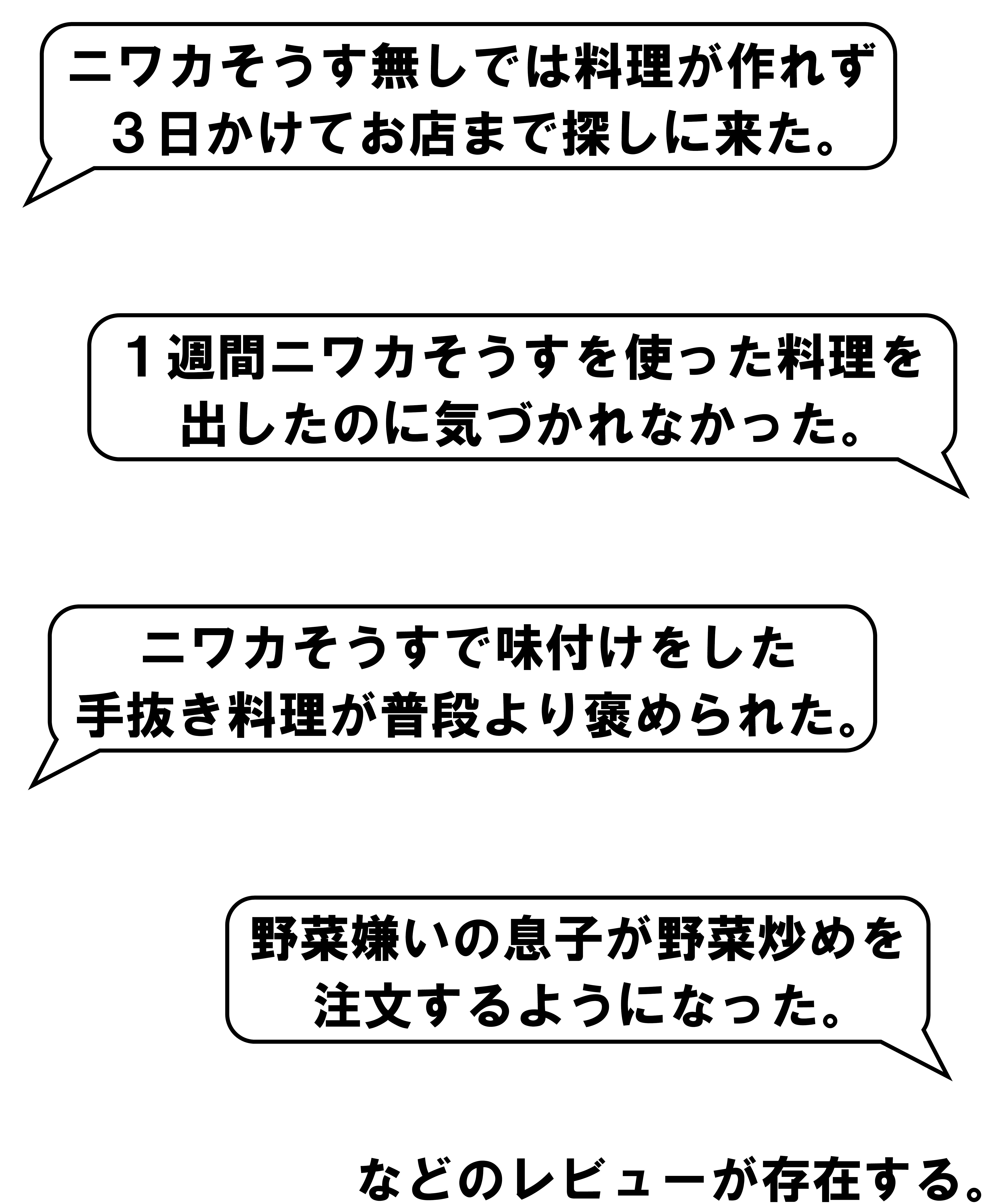 実は一週間の料理を「ニワカそうす」だけで味つけした方がいらっしゃって、ご家族は気づかなかった・・・というエピソードもあるほどです。
