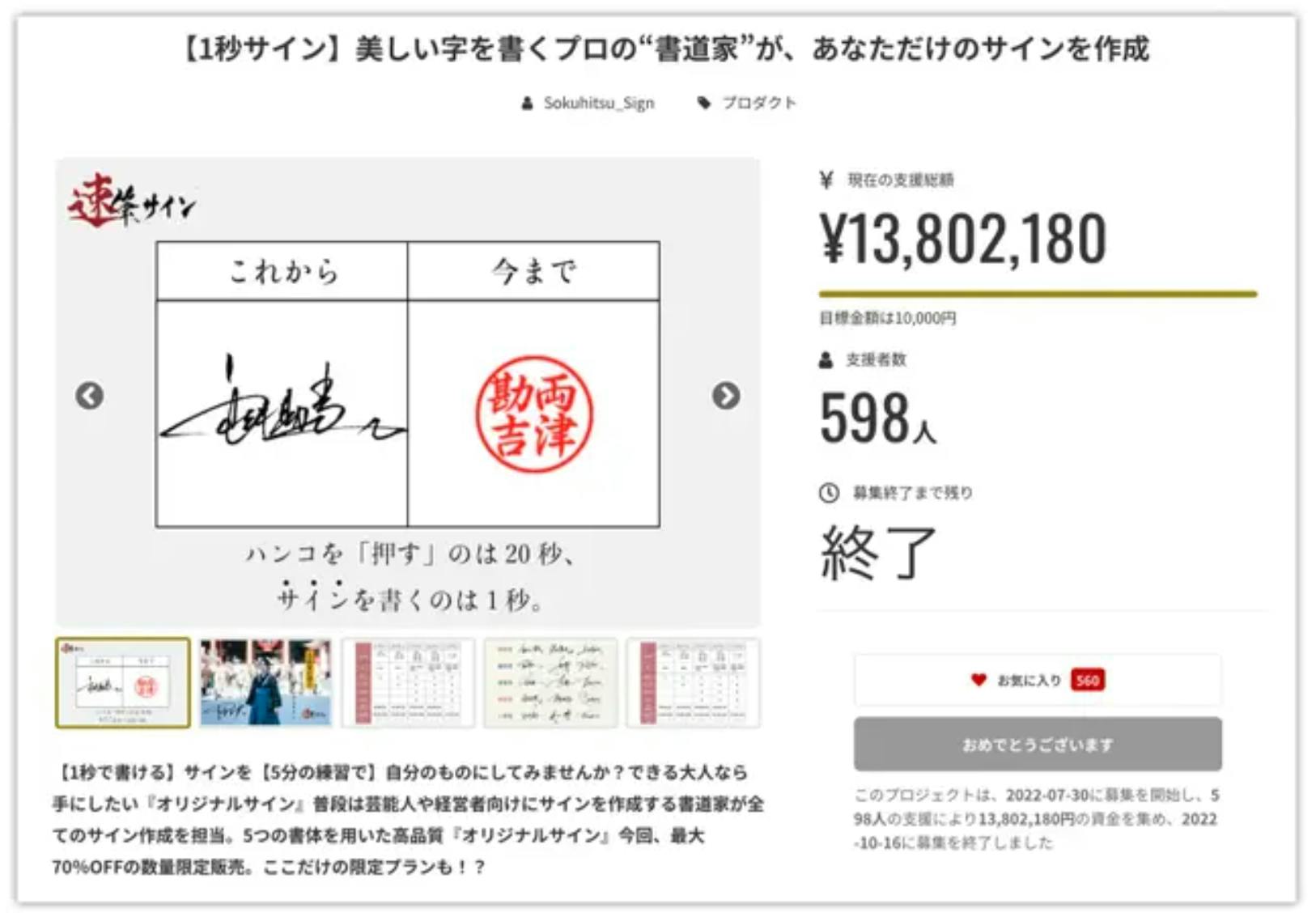 初めてのMakuakeプロジェクト実施で2,600万円越えの支援金額を集め、サイン部門1位を獲得致しました。