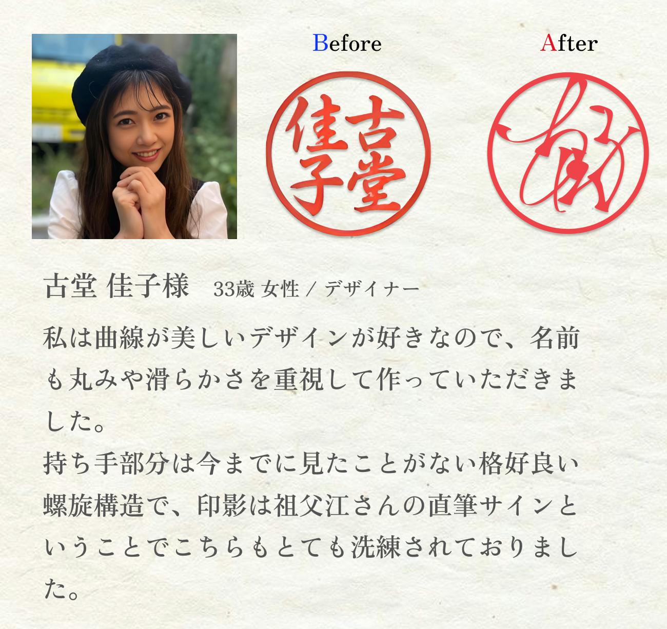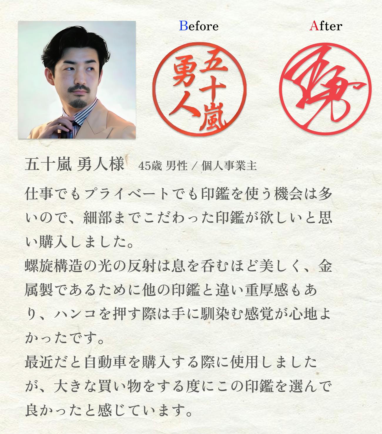 「あなたのお名前を吟味し創られた世界に一つの印鑑」であり、「“自分らしさ”をカタチにするお手伝いをしたいという我々の想いがこもった印鑑」です。
