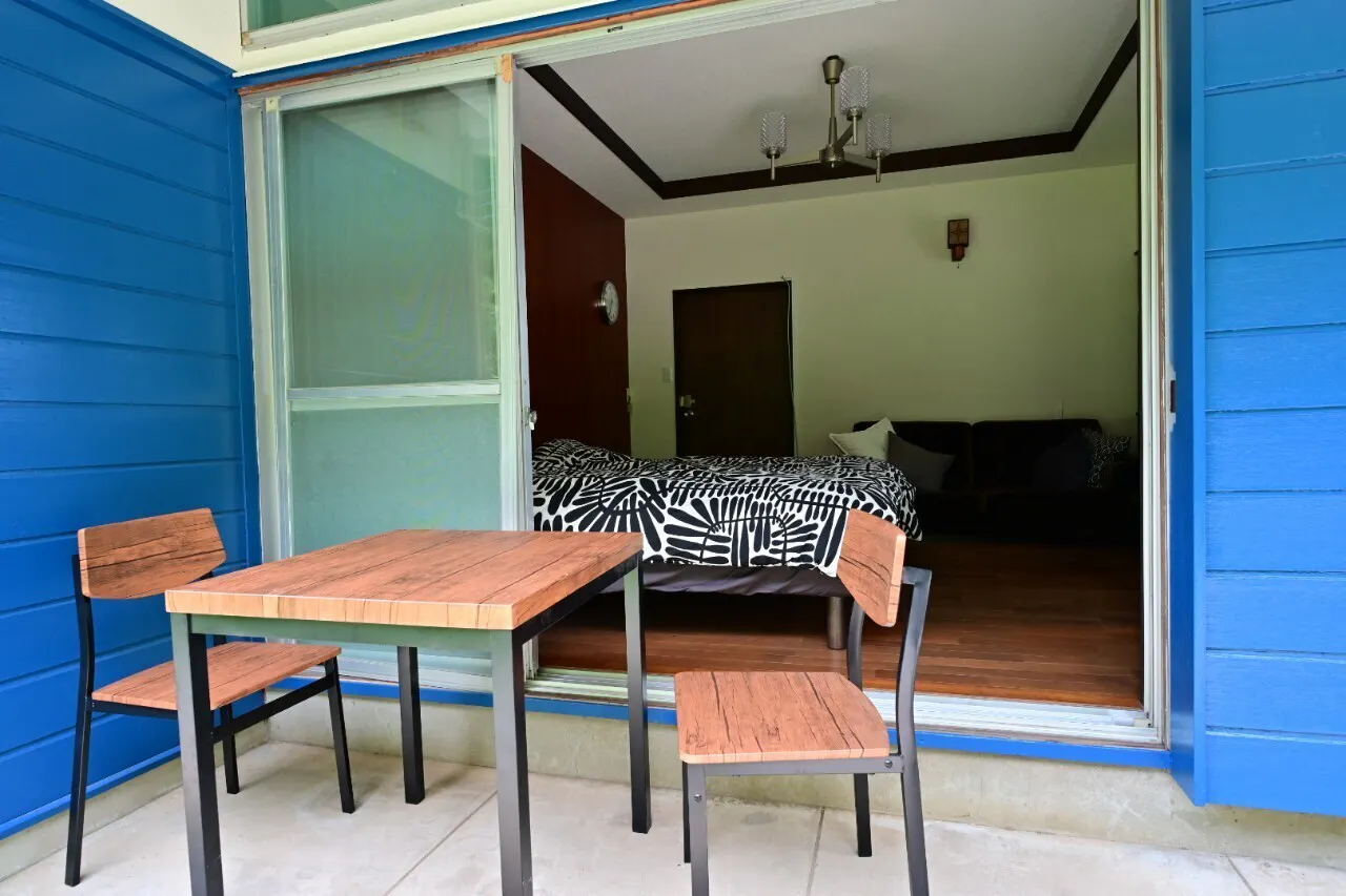 大きな窓を開けると、デッキのテーブルセットと直通。