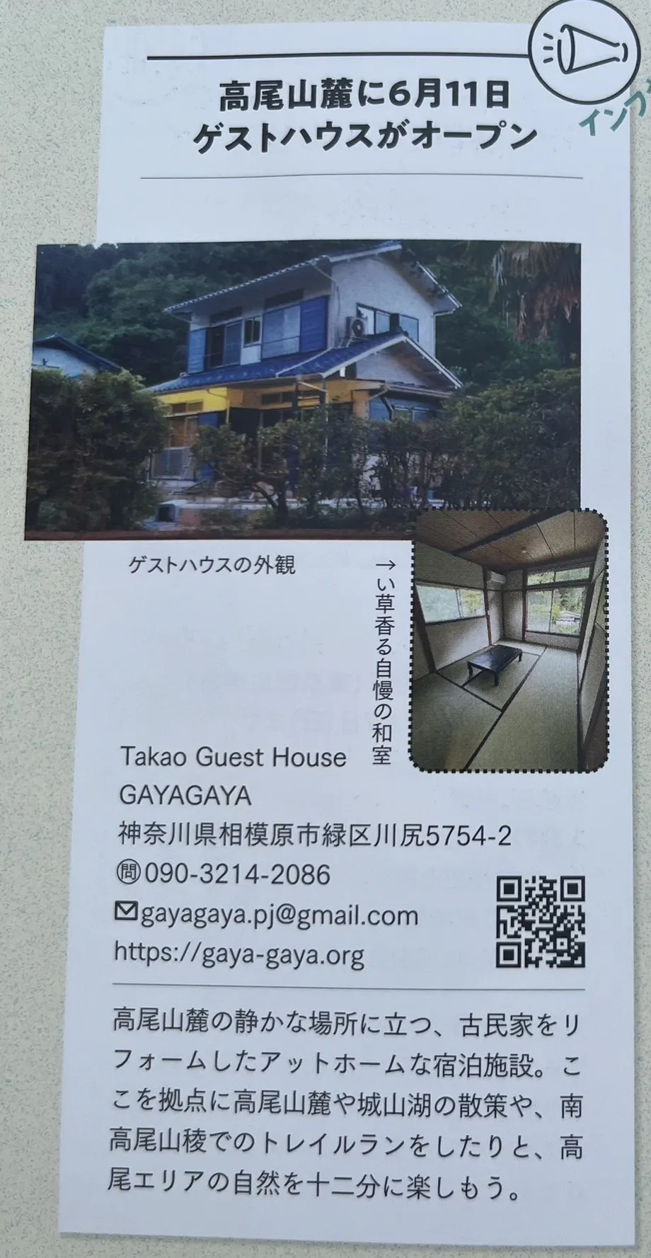 私達は、福島原発事故の影響で地元での自然体験の機会が少なくなってきた福島県を中心とする東北の子ども達のため、高尾山麓の大自然の中で保養できる『Takao Guest House GAYAGAYA』をスタートさせます。