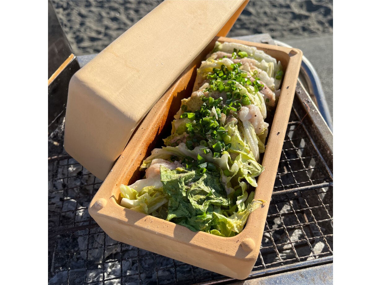 焚火に入れても、バーベキューコンロに入れても鉄板の上でも調理できます。天然粘土+密閉性で石窯と同じ「輻射熱」と「高温水蒸気」で食材の旨味をグッと閉じ込めます。